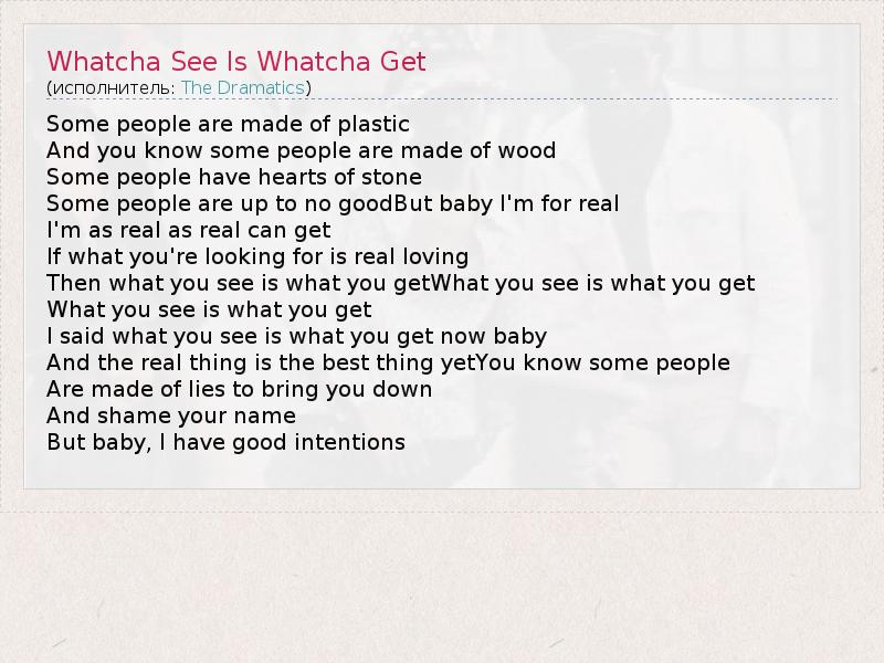 А как ты думаешь, о чем песня "Whatcha See Is Whatcha Get" ?