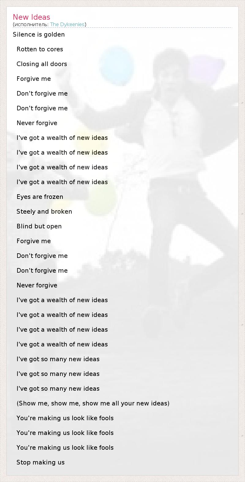Silence is golden Rotten to cores Closing all doors Forgive me Don't forgive me Don't forgive me Never forgive I've got a wealth of new ideas I've got a wealth of new ideas I've got a wealth of new ideas I've got a wealth of new ideas Eyes are frozen Steely and broken Blind but open Forgive me Don't forgive me Don't forgive me Never forgive I've got a wealth of new ideas I've got a wealth of new ideas I've got a wealth of new ideas I've got a wealth of new ideas I've got so many new ideas I've got so many new ideas I've got so many new ideas (Show me, show me, show me all your new ideas) You're making us look like fools You're making us look like fools You're making us look like fools Stop making us