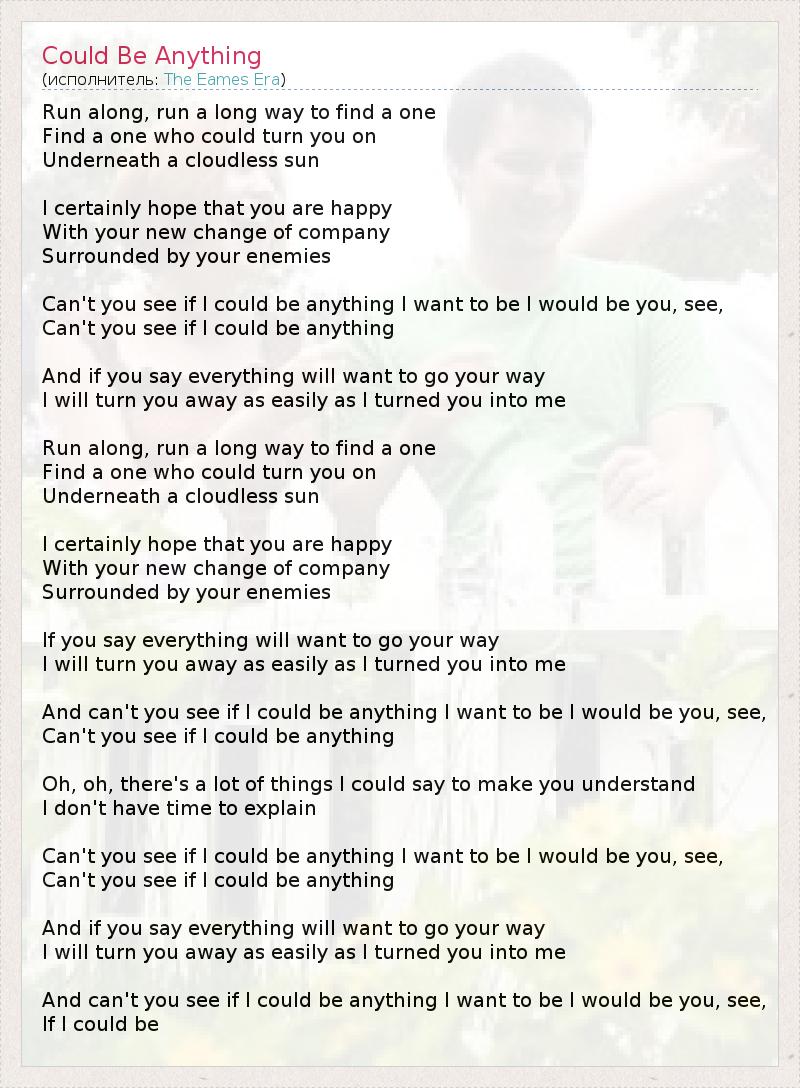 Run along, run a long way to find a one Find a one who could turn you on Underneath a cloudless sun I certainly hope that you are happy With your new change of company Surrounded by your enemies Can't you see if I could be anything I want to be I would be you, see, Can't you see if I could be anything And if you say everything will want to go your way I will turn you away as easily as I turned you into me Run along, run a long way to find a one Find a one who could turn you on Underneath a cloudless sun I certainly hope that you are happy With your new change of company Surrounded by your enemies If you say everything will want to go your way I will turn you away as easily as I turned you into me And can't you see if I could be anything I want to be I would be you, see, Can't you see if I could be anything Oh, oh, there's a lot of things I could say to make you understand I don't have time to explain Can't you see if I could be anything I want to be I would be you, see, Can't you see if I could be anything And if you say everything will want to go your way I will turn you away as easily as I turned you into me And can't you see if I could be anything I want to be I would be you, see, If I could be