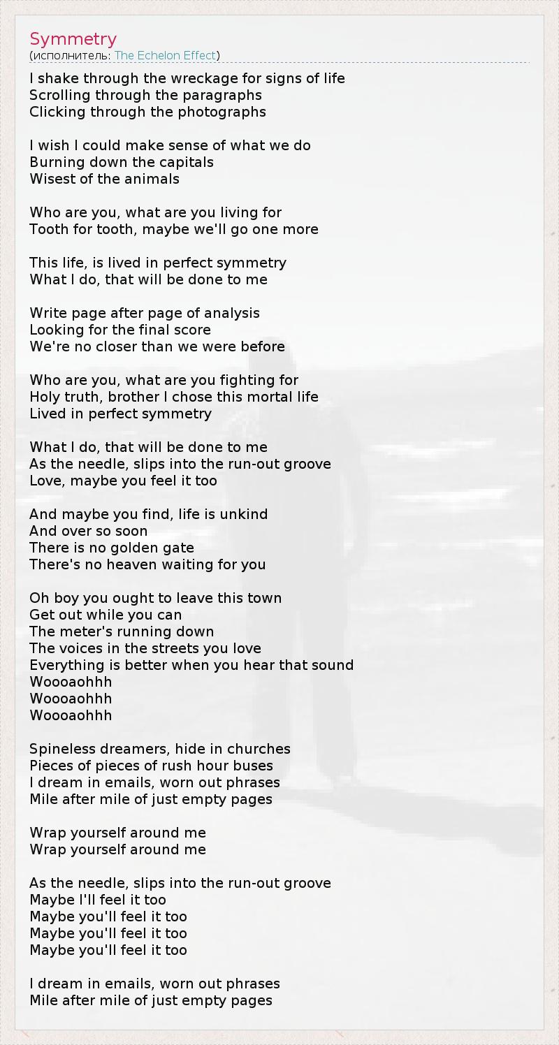 Я прорываюсь сквозь крах всех признаков жизни, Проглядываю абзацы, Щёлкаю по фотографиям. Жаль, что я не могу придать смысла нашим действиям – Мы сжигаем столицы, Самые мудрые из животных… Кто ты, для чего ты живёшь? Зуб за зуб, может, мы начнём ещё раз. Эту жизнь мы живём в идеальной симметрии: Все мои поступки отзовутся мне. Пишутся исследования, страница за страницей В поисках окончательного вывода, Но сейчас мы не ближе к нему, чем были в начале. Кто ты, ради чего ты борешься? Святая правда, брат, я выбрал эту смертную жизнь, Прожитую в идеальной симметрии. Результаты моих поступков вернутся ко мне, Как игла выскальзывает из стежка. Любовь, быть может, ты тоже её ощущаешь… Быть может, ты поймёшь, что жизнь зла И так скоротечна, И нет золотых врат, Рай не ждёт тебя. О, мальчик, ты должен уехать из этого города, Выбирайся, пока можешь, Показатели снижаются. Голоса на улицах, которые ты любишь, Всё улучшается, когда ты слышишь этот звук. Ооооооууу! Ооооооууу! Ооооооууу! Безвольные мечтатели, прячьтесь в церквях, Суетливое движение автобусов по расписанию, Я мечтаю по электронной почте На многих милях абсолютно пустых страниц. Окутай меня собой, Окутай меня собой… Как игла, выскальзывает из стежка, Может быть, я тоже это почувствую, Может быть, я тоже это почувствую, Может быть, я тоже это почувствую. Я мечтаю в письмах по электронной почте, избитыми фразами На многих милях абсолютно пустых страниц.