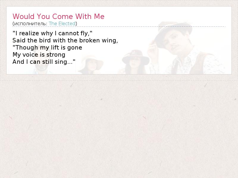 А как ты думаешь, о чем песня "Would You Come With Me" ?