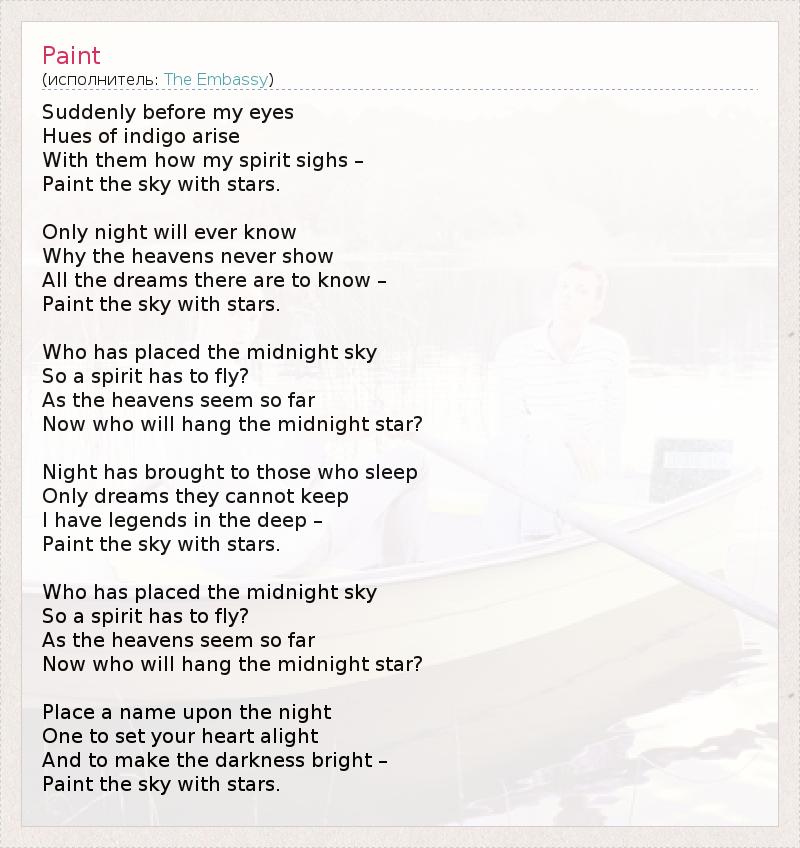 Suddenly before my eyes Hues of indigo arise With them how my spirit sighs – Paint the sky with stars. Only night will ever know Why the heavens never show All the dreams there are to know – Paint the sky with stars. Who has placed the midnight sky So a spirit has to fly? As the heavens seem so far Now who will hang the midnight star? Night has brought to those who sleep Only dreams they cannot keep I have legends in the deep – Paint the sky with stars. Who has placed the midnight sky So a spirit has to fly? As the heavens seem so far Now who will hang the midnight star? Place a name upon the night One to set your heart alight And to make the darkness bright – Paint the sky with stars.