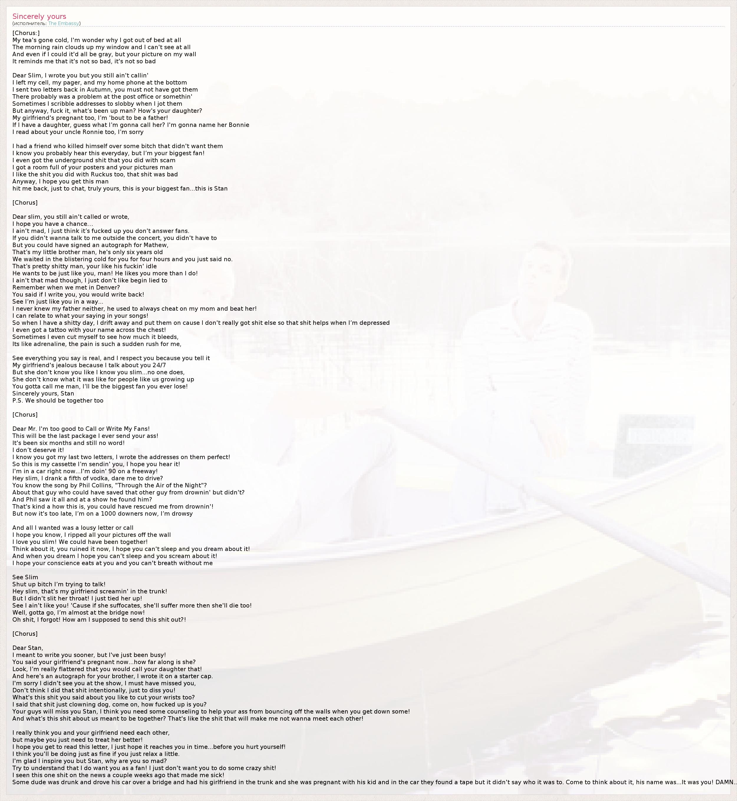 [Chorus:] My tea's gone cold, I'm wonder why I got out of bed at all The morning rain clouds up my window and I can't see at all And even if I could it'd all be gray, but your picture on my wall It reminds me that it's not so bad, it's not so bad Dear Slim, I wrote you but you still ain't callin' I left my cell, my pager, and my home phone at the bottom I sent two letters back in Autumn, you must not have got them There probably was a problem at the post office or somethin' Sometimes I scribble addresses to slobby when I jot them But anyway, fuck it, what’s been up man? How's your daughter? My girlfriend's pregnant too, I’m 'bout to be a father! If I have a daughter, guess what I’m gonna call her? I'm gonna name her Bonnie I read about your uncle Ronnie too, I’m sorry I had a friend who killed himself over some bitch that didn't want them I know you probably hear this everyday, but I’m your biggest fan! I even got the underground shit that you did with scam I got a room full of your posters and your pictures man I like the shit you did with Ruckus too, that shit was bad Anyway, I hope you get this man hit me back, just to chat, truly yours, this is your biggest fan...this is Stan [Chorus] Dear slim, you still ain't called or wrote, I hope you have a chance… I ain't mad, I just think it’s fucked up you don't answer fans. If you didn't wanna talk to me outside the concert, you didn't have to But you could have signed an autograph for Mathew, That’s my little brother man, he's only six years old We waited in the blistering cold for you for four hours and you just said no. That’s pretty shitty man, your like his fuckin' idle He wants to be just like you, man! He likes you more than I do! I ain't that mad though, I just don't like begin lied to Remember when we met in Denver? You said if I write you, you would write back! See I’m just like you in a way... I never knew my father neither, he used to always cheat on my mom and beat her! I can relate to what your saying in your songs! So when I have a shitty day, I drift away and put them on cause I don't really got shit else so that shit helps when I’m depressed I even got a tattoo with your name across the chest! Sometimes I even cut myself to see how much it bleeds, Its like adrenaline, the pain is such a sudden rush for me, See everything you say is real, and I respect you because you tell it My girlfriend's jealous because I talk about you 24/7 But she don't know you like I know you slim...no one does, She don't know what it was like for people like us growing up You gotta call me man, I’ll be the biggest fan you ever lose! Sincerely yours, Stan P.S. We should be together too [Chorus] Dear Mr. I'm too good to Call or Write My Fans! This will be the last package I ever send your ass! It's been six months and still no word! I don’t deserve it! I know you got my last two letters, I wrote the addresses on them perfect! So this is my cassette I’m sendin' you, I hope you hear it! I'm in a car right now...I'm doin' 90 on a freeway! Hey slim, I drank a fifth of vodka, dare me to drive? You know the song by Phil Collins, "Through the Air of the Night"? About that guy who could have saved that other guy from drownin' but didn't? And Phil saw it all and at a show he found him? That's kind a how this is, you could have rescued me from drownin'! But now it's too late, I’m on a 1000 downers now, I’m drowsy And all I wanted was a lousy letter or call I hope you know, I ripped all your pictures off the wall I love you slim! We could have been together! Think about it, you ruined it now, I hope you can't sleep and you dream about it! And when you dream I hope you can't sleep and you scream about it! I hope your conscience eats at you and you can't breath without me See Slim Shut up bitch I’m trying to talk! Hey slim, that's my girlfriend screamin' in the trunk! But I didn't slit her throat! I just tied her up! See I ain't like you! 'Cause if she suffocates, she'll suffer more then she'll die too! Well, gotta go, I’m almost at the bridge now! Oh shit, I forgot! How am I supposed to send this shit out?! [Chorus] Dear Stan, I meant to write you sooner, but I've just been busy! You said your girlfriend's pregnant now...how far along is she? Look, I’m really flattered that you would call your daughter that! And here's an autograph for your brother, I wrote it on a starter cap. I'm sorry I didn't see you at the show, I must have missed you, Don't think I did that shit intentionally, just to diss you! What's this shit you said about you like to cut your wrists too? I said that shit just clowning dog, come on, how fucked up is you? Your guys will miss you Stan, I think you need some counseling to help your ass from bouncing off the walls when you get down some! And what’s this shit about us meant to be together? That's like the shit that will make me not wanna meet each other! I really think you and your girlfriend need each other, but maybe you just need to treat her better! I hope you get to read this letter, I just hope it reaches you in time...before you hurt yourself! I think you'll be doing just as fine if you just relax a little. I'm glad I inspire you but Stan, why are you so mad? Try to understand that I do want you as a fan! I just don't want you to do some crazy shit! I seen this one shit on the news a couple weeks ago that made me sick! Some dude was drunk and drove his car over a bridge and had his girlfriend in the trunk and she was pregnant with his kid and in the car they found a tape but it didn't say who it was to. Come to think about it, his name was...It was you! DAMN..