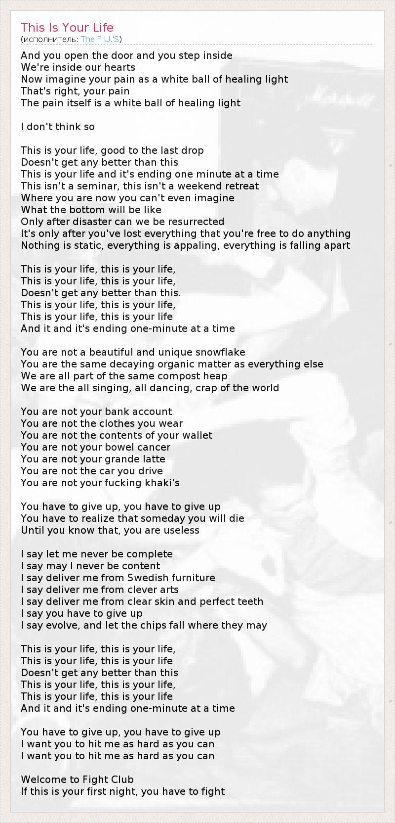 Вы открываете дверь и заходите внутрь. Мы внутри наших сердец. Теперь представьте, что ваша боль - это шар белого исцеляющего света, Всё верно, ваша боль, Сама боль - это шар белого исцеляющего света. Я так не думаю. Это твоя жизнь, прекрасная до конца*, И тебе не получить лучшего. Это твоя жизнь, и с каждой минутой она близится к концу. Это не семинар, это не посещение группы по выходным, С того места, где ты сейчас, ты даже представить не можешь, Как будет выглядеть крайняя черта. Только пройдя бедствие, мы можем переродиться вновь. Только утратив всё, ты можешь приобрести свободу. Ничто не постоянно, всё меняется, всё разрушается. Это твоя жизнь, это твоя жизнь, Это твоя жизнь, это твоя жизнь, И тебе не получить лучшего. Это твоя жизнь, это твоя жизнь, Это твоя жизнь, это твоя жизнь, И с каждой минутой она близится к концу. Никто из вас не обладает красотой и уникальностью снежинки! Вы - такая же гниющая органическая масса, как и всё остальное, Мы - часть одной навозной кучи, Мы - кучка поющих и пляшущих испражнений мира. Ты - это не твой банковский счет! Ты - это не одежда, которую ты носишь! Ты - это не содержимое твоего кошелка! Ты - это не рак твоего кишечника! Ты - это не твоя чашка гранд латте! Ты - это не машина, которую ты водишь! Ты - это не твои чертовы брюки хаки! Ты должен сдаться, ты должен сдаться, Ты должен признать, что когда-нибудь ты умрешь, До тех пор, ты бесполезен. Я говорю: "Не хочу больше быть самим совершенством." Я говорю: "Не хочу больше быть довольным." Я говорю: "Спаси меня от шведской мебели!" Я говорю: "Спаси меня от произведений искусства!" Я говорю: "Спаси меня от чистой кожи и идеальных зубов!" Я говорю: "Ты должен сдаться." Я говорю: "Развивайся, и будь что будет." Это твоя жизнь, это твоя жизнь, Это твоя жизнь, это твоя жизнь, И тебе не получить лучшего. Это твоя жизнь, это твоя жизнь, Это твоя жизнь, это твоя жизнь, И с каждой минутой она близится к концу. Ты должен сдаться, ты должен сдаться, Я хочу, чтобы ты врезал мне изо всей силы! Я хочу, чтобы ты врезал мне изо всей силы! Добро пожаловать в Бойцовский Клуб. Новичок обязан принять бой. * - досл.: до последней капли