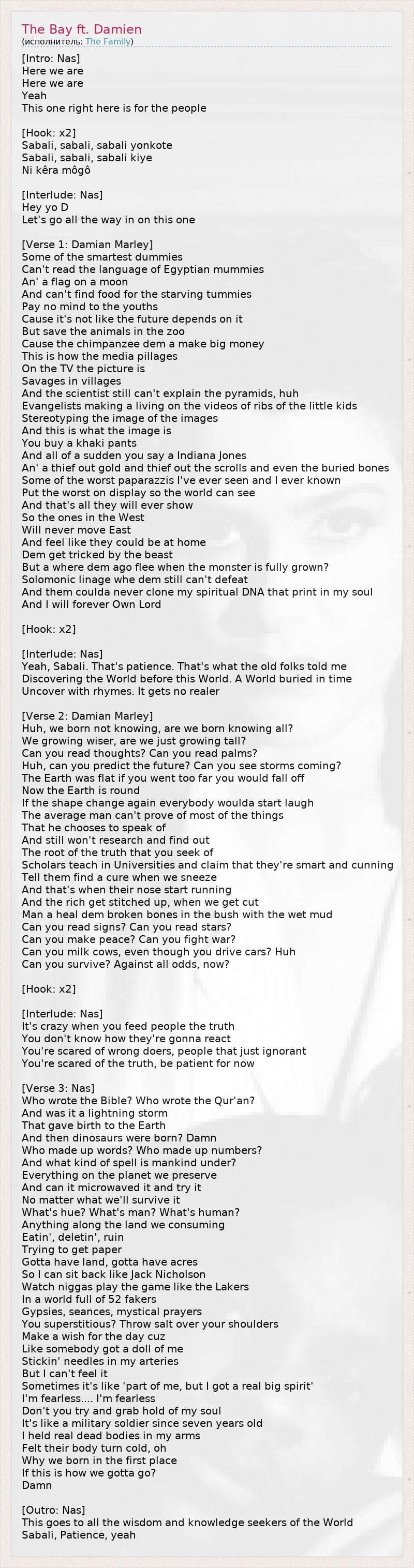 А как ты думаешь, о чем песня "The Bay ft. Damien" ?