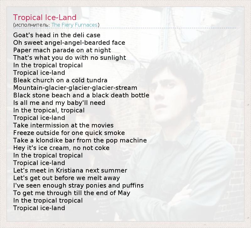 Goat's head in the deli case Oh sweet angel-angel-bearded face Paper mach parade on at night That's what you do with no sunlight In the tropical tropical Tropical ice-land Bleak church on a cold tundra Mountain-glacier-glacier-glacier-stream Black stone beach and a black death bottle Is all me and my baby'll need In the tropical, tropical Tropical ice-land Take intermission at the movies Freeze outside for one quick smoke Take a klondike bar from the pop machine Hey it's ice cream, no not coke In the tropical tropical Tropical ice-land Let's meet in Kristiana next summer Let's get out before we melt away I've seen enough stray ponies and puffins To get me through till the end of May In the tropical tropical Tropical ice-land