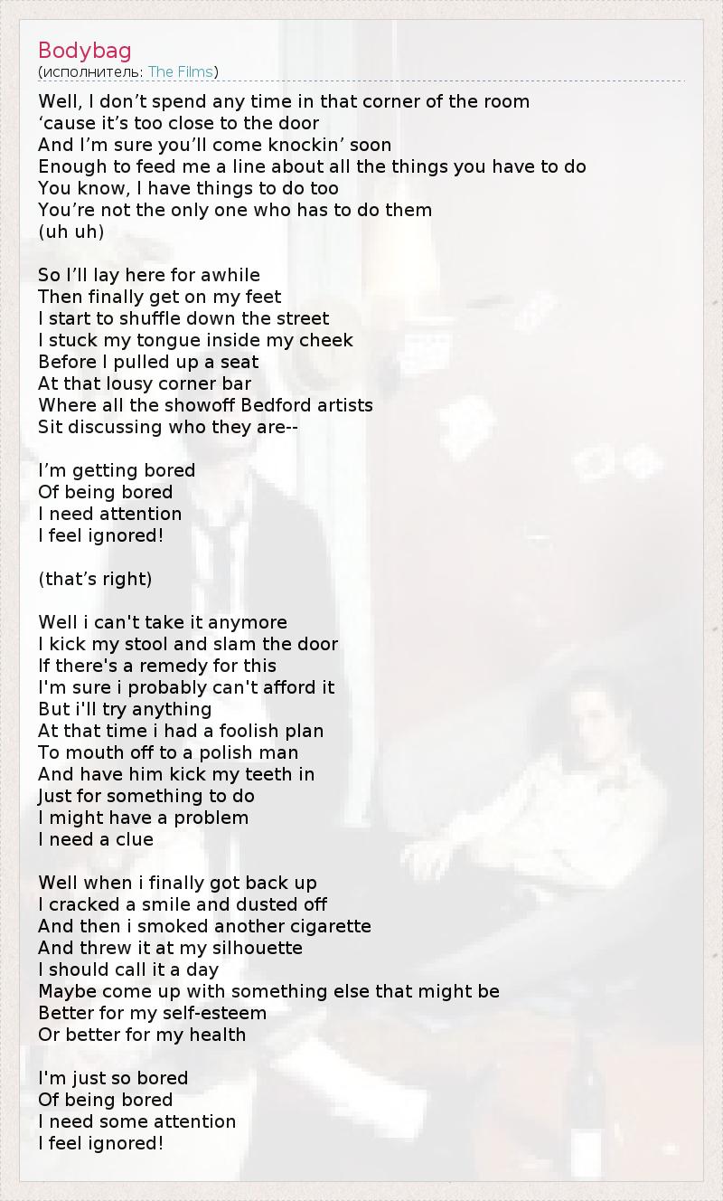 Well, I don’t spend any time in that corner of the room ‘cause it’s too close to the door And I’m sure you’ll come knockin’ soon Enough to feed me a line about all the things you have to do You know, I have things to do too You’re not the only one who has to do them (uh uh) So I’ll lay here for awhile Then finally get on my feet I start to shuffle down the street I stuck my tongue inside my cheek Before I pulled up a seat At that lousy corner bar Where all the showoff Bedford artists Sit discussing who they are-- I’m getting bored Of being bored I need attention I feel ignored! (that’s right) Well i can't take it anymore I kick my stool and slam the door If there's a remedy for this I'm sure i probably can't afford it But i'll try anything At that time i had a foolish plan To mouth off to a polish man And have him kick my teeth in Just for something to do I might have a problem I need a clue Well when i finally got back up I cracked a smile and dusted off And then i smoked another cigarette And threw it at my silhouette I should call it a day Maybe come up with something else that might be Better for my self-esteem Or better for my health I'm just so bored Of being bored I need some attention I feel ignored!