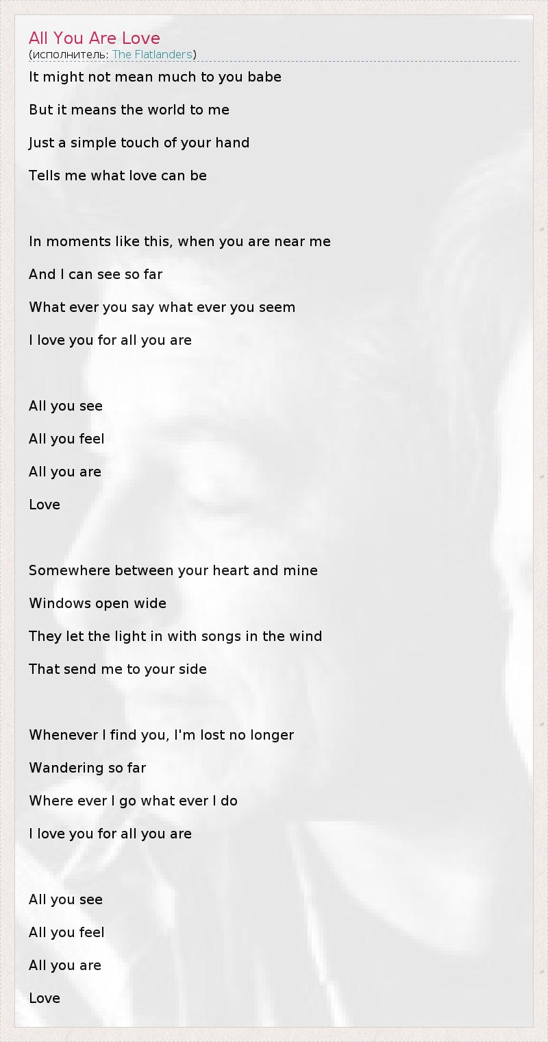 It might not mean much to you babe But it means the world to me Just a simple touch of your hand Tells me what love can be In moments like this, when you are near me And I can see so far What ever you say what ever you seem I love you for all you are All you see All you feel All you are Love Somewhere between your heart and mine Windows open wide They let the light in with songs in the wind That send me to your side Whenever I find you, I'm lost no longer Wandering so far Where ever I go what ever I do I love you for all you are All you see All you feel All you are Love