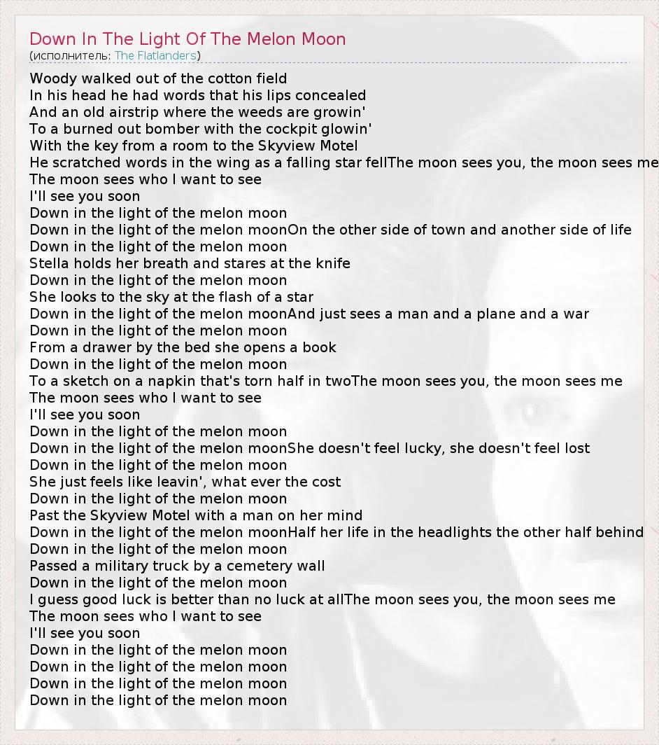 Down in the light of the melon moonShe doesn't feel lucky, she doesn't feel lost