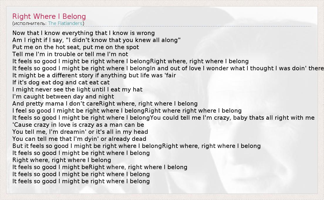 Now that I know everything that I know is wrong Am I right if I say, "I didn't know that you knew all along" Put me on the hot seat, put me on the spot Tell me I'm in trouble or tell me I'm not It feels so good I might be right where I belongRight where, right where I belong It feels so good I might be right where I belongIn and out of love I wonder what I thought I was doin' there It might be a different story if anything but life was 'fair If it's dog eat dog and cat eat cat I might never see the light until I eat my hat I'm caught between day and night And pretty mama I don't careRight where, right where I belong I feel so good I might be right where I belongRight where right where I belong It feels so good I might be right where I belongYou could tell me I'm crazy, baby thats all right with me 'Cause crazy in love is crazy as a man can be You tell me, I'm dreamin' or it's all in my head You can tell me that I'm dyin' or already dead But it feels so good I might be right where I belongRight where, right where I belong It feels so good I might be right where I belong Right where, right where I belong It feels so good I might beRight where, right where I belong It feels so good I might be right where I belong It feels so good I might be right where I belong