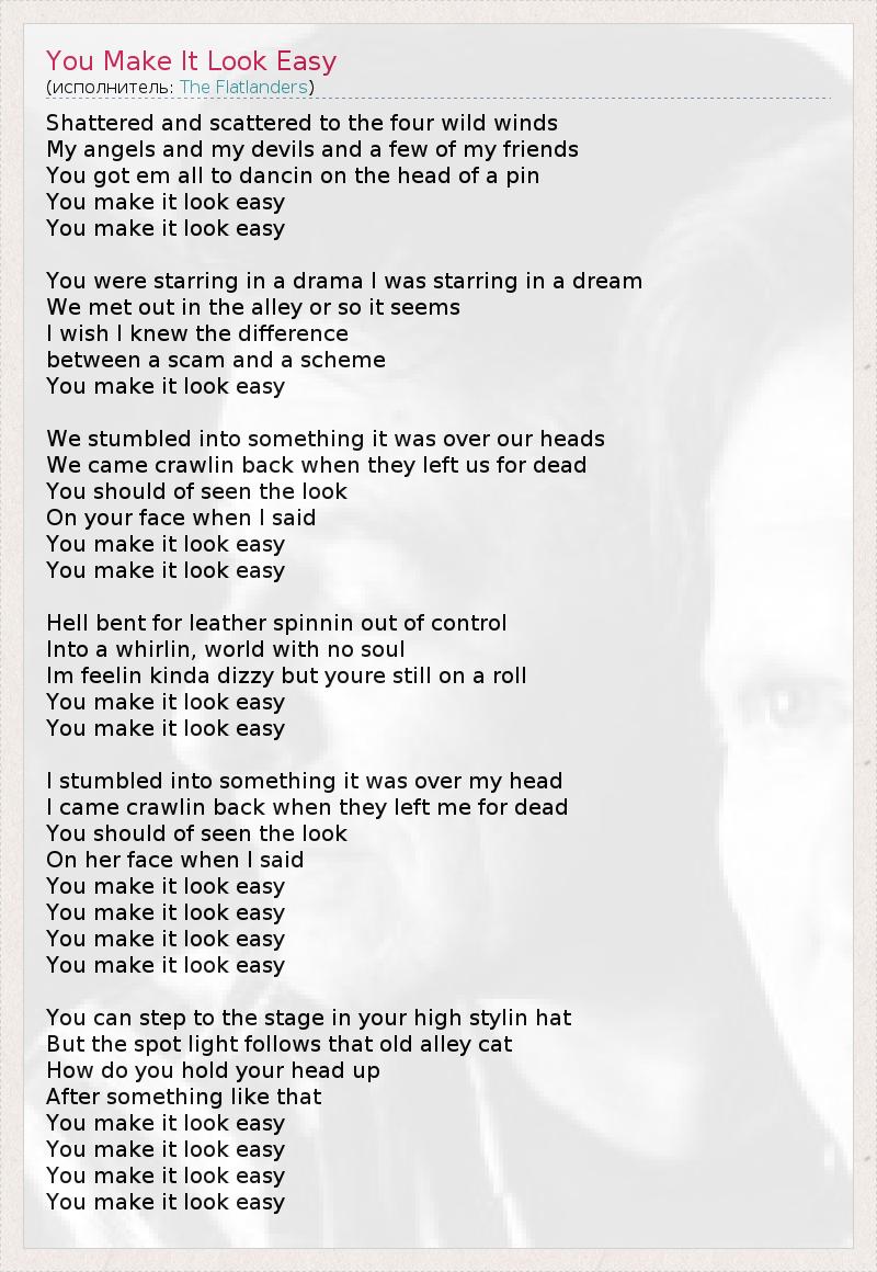 Shattered and scattered to the four wild winds My angels and my devils and a few of my friends You got em all to dancin on the head of a pin You make it look easy You make it look easy You were starring in a drama I was starring in a dream We met out in the alley or so it seems I wish I knew the difference between a scam and a scheme You make it look easy We stumbled into something it was over our heads We came crawlin back when they left us for dead You should of seen the look On your face when I said You make it look easy You make it look easy Hell bent for leather spinnin out of control Into a whirlin, world with no soul Im feelin kinda dizzy but youre still on a roll You make it look easy You make it look easy I stumbled into something it was over my head I came crawlin back when they left me for dead You should of seen the look On her face when I said You make it look easy You make it look easy You make it look easy You make it look easy You can step to the stage in your high stylin hat But the spot light follows that old alley cat How do you hold your head up After something like that You make it look easy You make it look easy You make it look easy You make it look easy