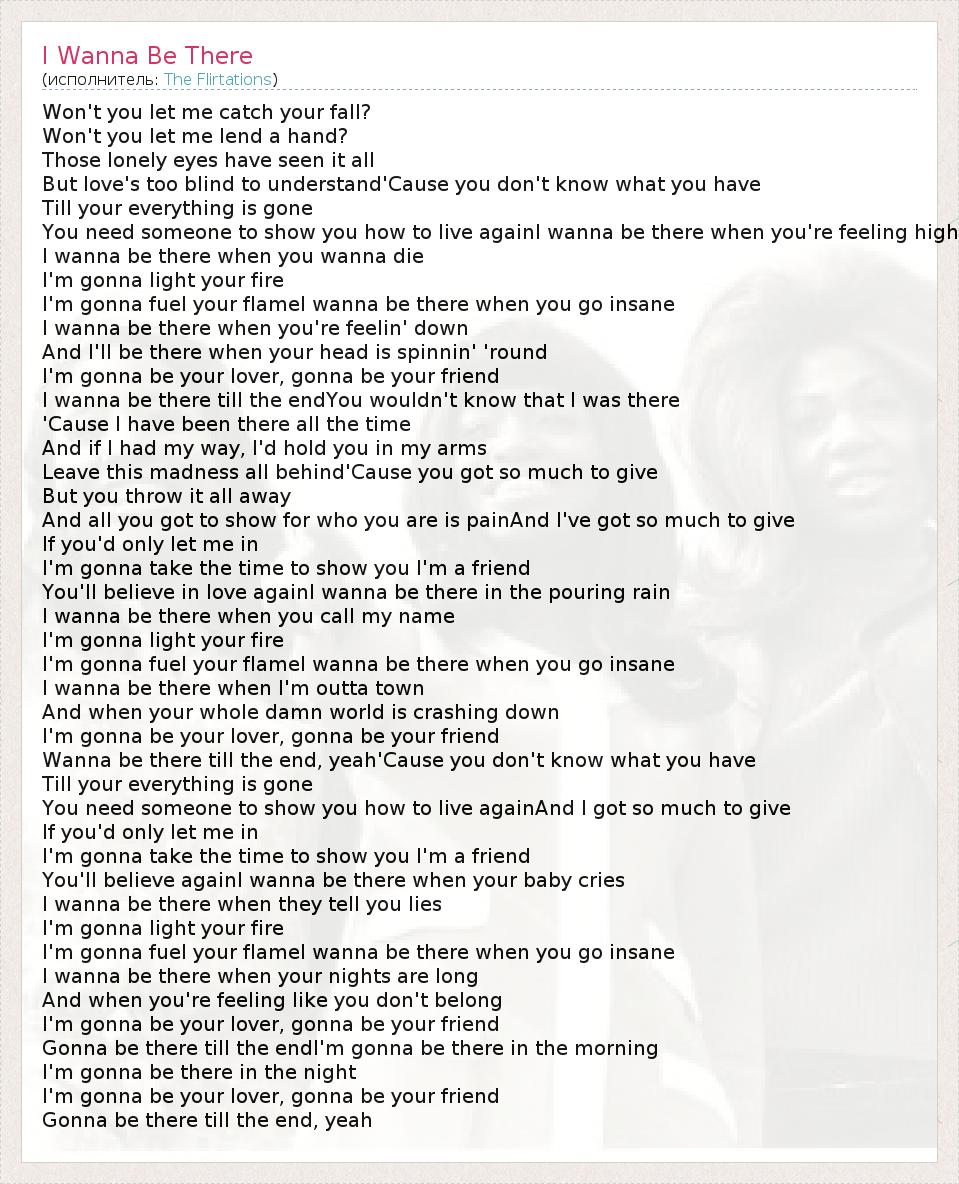 Won't you let me catch your fall? Won't you let me lend a hand? Those lonely eyes have seen it all But love's too blind to understand'Cause you don't know what you have Till your everything is gone You need someone to show you how to live againI wanna be there when you're feeling high I wanna be there when you wanna die I'm gonna light your fire I'm gonna fuel your flameI wanna be there when you go insane I wanna be there when you're feelin' down And I'll be there when your head is spinnin' 'round I'm gonna be your lover, gonna be your friend I wanna be there till the endYou wouldn't know that I was there 'Cause I have been there all the time And if I had my way, I'd hold you in my arms Leave this madness all behind'Cause you got so much to give But you throw it all away And all you got to show for who you are is painAnd I've got so much to give If you'd only let me in I'm gonna take the time to show you I'm a friend You'll believe in love againI wanna be there in the pouring rain I wanna be there when you call my name I'm gonna light your fire I'm gonna fuel your flameI wanna be there when you go insane I wanna be there when I'm outta town And when your whole damn world is crashing down I'm gonna be your lover, gonna be your friend Wanna be there till the end, yeah'Cause you don't know what you have Till your everything is gone You need someone to show you how to live againAnd I got so much to give If you'd only let me in I'm gonna take the time to show you I'm a friend You'll believe againI wanna be there when your baby cries I wanna be there when they tell you lies I'm gonna light your fire I'm gonna fuel your flameI wanna be there when you go insane I wanna be there when your nights are long And when you're feeling like you don't belong I'm gonna be your lover, gonna be your friend Gonna be there till the endI'm gonna be there in the morning I'm gonna be there in the night I'm gonna be your lover, gonna be your friend Gonna be there till the end, yeah
