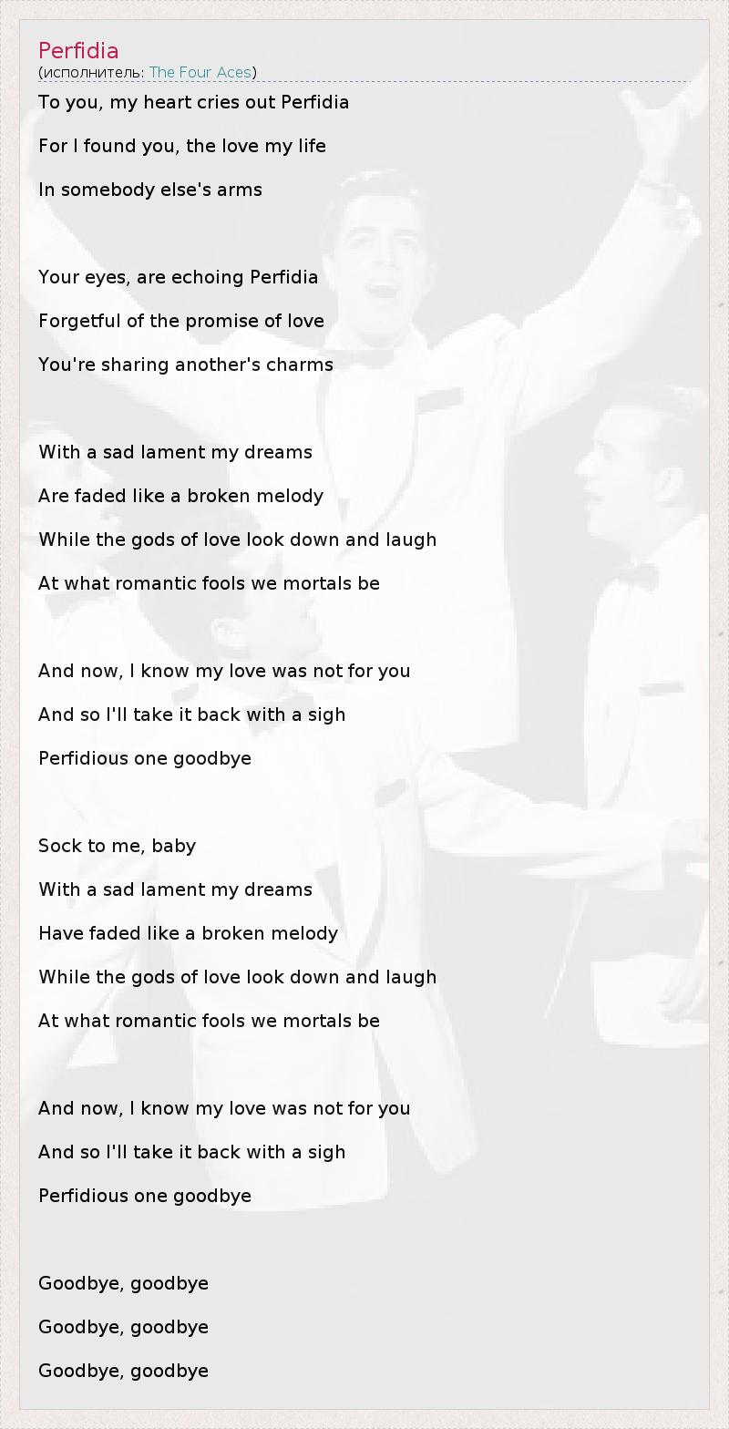 To you, my heart cries out Perfidia For I found you, the love my life In somebody else's arms Your eyes, are echoing Perfidia Forgetful of the promise of love You're sharing another's charms With a sad lament my dreams Are faded like a broken melody While the gods of love look down and laugh At what romantic fools we mortals be And now, I know my love was not for you And so I'll take it back with a sigh Perfidious one goodbye Sock to me, baby With a sad lament my dreams Have faded like a broken melody While the gods of love look down and laugh At what romantic fools we mortals be And now, I know my love was not for you And so I'll take it back with a sigh Perfidious one goodbye Goodbye, goodbye Goodbye, goodbye Goodbye, goodbye