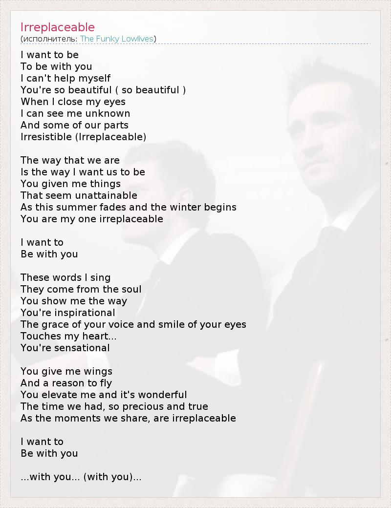 I want to be To be with you I can't help myself You're so beautiful ( so beautiful ) When I close my eyes I can see me unknown And some of our parts Irresistible (Irreplaceable) The way that we are Is the way I want us to be You given me things That seem unattainable As this summer fades and the winter begins You are my one irreplaceable I want to Be with you These words I sing They come from the soul You show me the way You're inspirational The grace of your voice and smile of your eyes Touches my heart... You're sensational You give me wings And a reason to fly You elevate me and it's wonderful The time we had, so precious and true As the moments we share, are irreplaceable I want to Be with you ...with you... (with you)...
