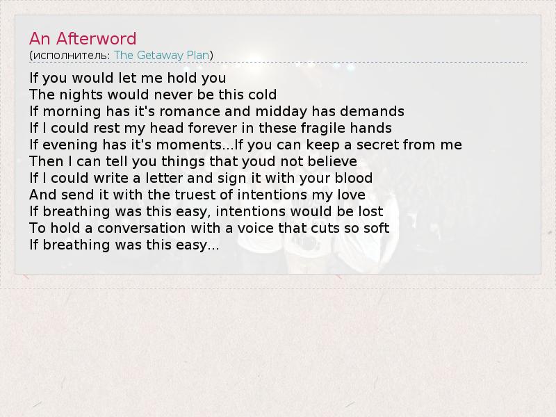 Это интересно:The Getaway Plan - австралийская альтернативная рок-группа из Мельбурна, штат Виктория, образованая в 2004 году. Состав группы сложился таким образом: вокалист и гитарист Matthew Wright, гитарист Clint Splattering, басист Dave Anderson и барабанщик Aaron Barnett.Их дебютный релиз был демо в 2004 году. В 2006 году группа подписала контракт с Boomtown Records и выпустили свой дебютный релиз, EP под названием "Hold... продолжение