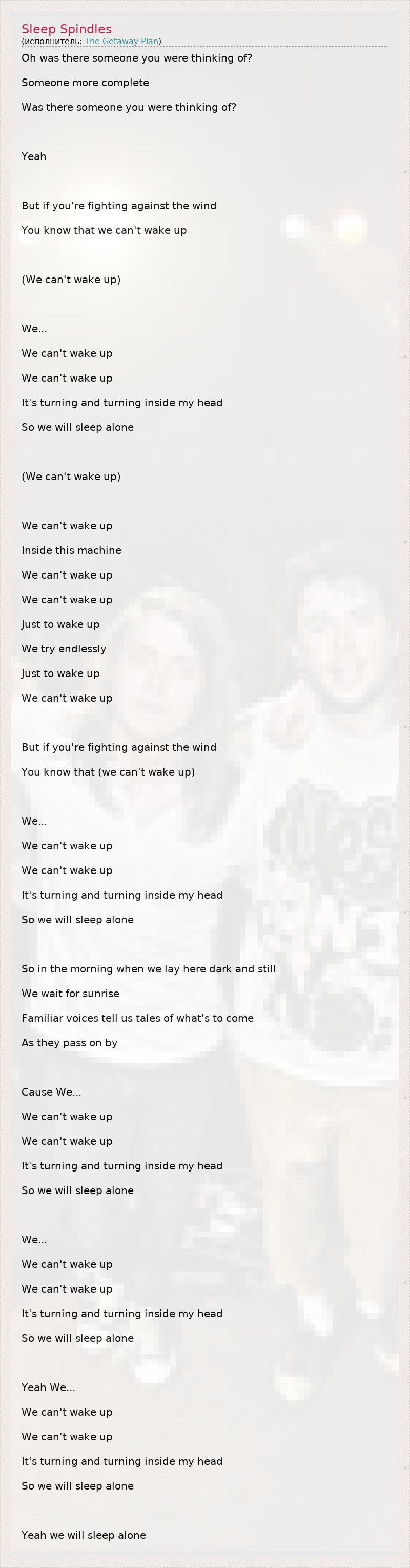 Oh was there someone you were thinking of? Someone more complete Was there someone you were thinking of? Yeah But if you're fighting against the wind You know that we can't wake up (We can't wake up) We... We can't wake up We can't wake up It's turning and turning inside my head So we will sleep alone (We can't wake up) We can't wake up Inside this machine We can't wake up We can't wake up Just to wake up We try endlessly Just to wake up We can't wake up But if you're fighting against the wind You know that (we can't wake up) We... We can't wake up We can't wake up It's turning and turning inside my head So we will sleep alone So in the morning when we lay here dark and still We wait for sunrise Familiar voices tell us tales of what's to come As they pass on by Cause We... We can't wake up We can't wake up It's turning and turning inside my head So we will sleep alone We... We can't wake up We can't wake up It's turning and turning inside my head So we will sleep alone Yeah We... We can't wake up We can't wake up It's turning and turning inside my head So we will sleep alone Yeah we will sleep alone