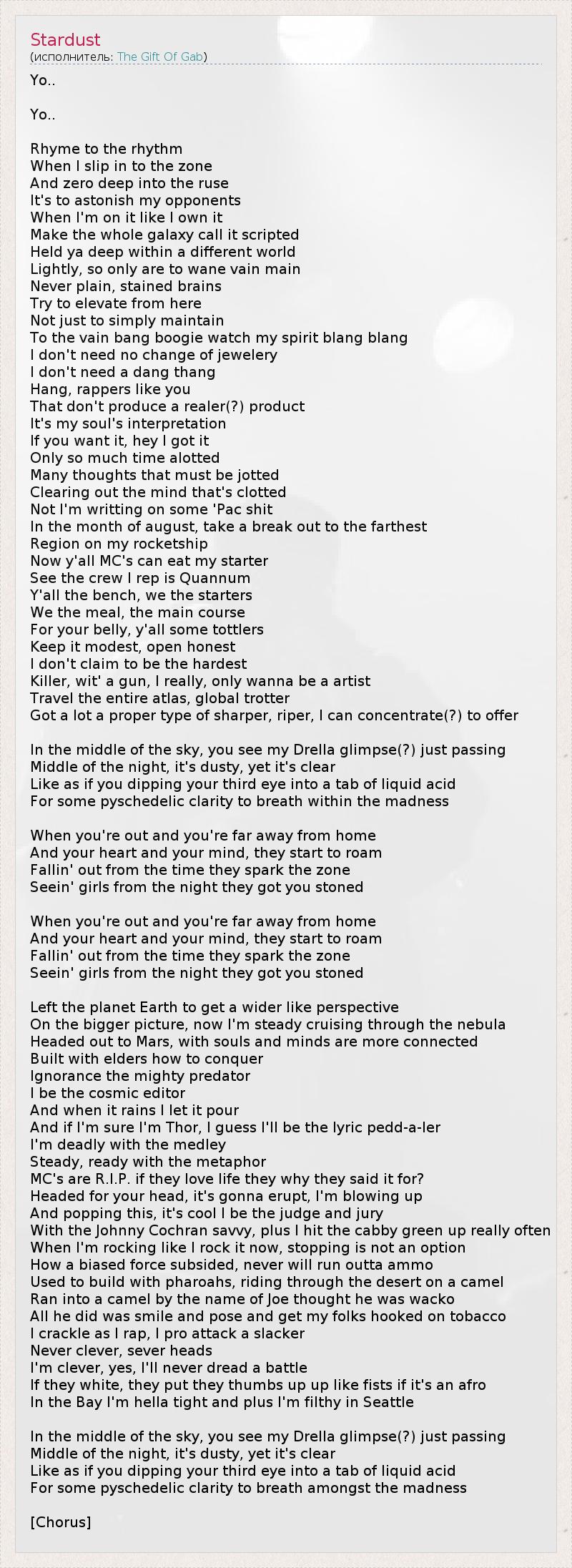 Yo.. Yo.. Rhyme to the rhythm When I slip in to the zone And zero deep into the ruse It's to astonish my opponents When I'm on it like I own it Make the whole galaxy call it scripted Held ya deep within a different world Lightly, so only are to wane vain main Never plain, stained brains Try to elevate from here Not just to simply maintain To the vain bang boogie watch my spirit blang blang I don't need no change of jewelery I don't need a dang thang Hang, rappers like you That don't produce a realer(?) product It's my soul's interpretation If you want it, hey I got it Only so much time alotted Many thoughts that must be jotted Clearing out the mind that's clotted Not I'm writting on some 'Pac shit In the month of august, take a break out to the farthest Region on my rocketship Now y'all MC's can eat my starter See the crew I rep is Quannum Y'all the bench, we the starters We the meal, the main course For your belly, y'all some tottlers Keep it modest, open honest I don't claim to be the hardest Killer, wit' a gun, I really, only wanna be a artist Travel the entire atlas, global trotter Got a lot a proper type of sharper, riper, I can concentrate(?) to offer In the middle of the sky, you see my Drella glimpse(?) just passing Middle of the night, it's dusty, yet it's clear Like as if you dipping your third eye into a tab of liquid acid For some pyschedelic clarity to breath within the madness When you're out and you're far away from home And your heart and your mind, they start to roam Fallin' out from the time they spark the zone Seein' girls from the night they got you stoned When you're out and you're far away from home And your heart and your mind, they start to roam Fallin' out from the time they spark the zone Seein' girls from the night they got you stoned Left the planet Earth to get a wider like perspective On the bigger picture, now I'm steady cruising through the nebula Headed out to Mars, with souls and minds are more connected Built with elders how to conquer Ignorance the mighty predator I be the cosmic editor And when it rains I let it pour And if I'm sure I'm Thor, I guess I'll be the lyric pedd-a-ler I'm deadly with the medley Steady, ready with the metaphor MC's are R.I.P. if they love life they why they said it for? Headed for your head, it's gonna erupt, I'm blowing up And popping this, it's cool I be the judge and jury With the Johnny Cochran savvy, plus I hit the cabby green up really often When I'm rocking like I rock it now, stopping is not an option How a biased force subsided, never will run outta ammo Used to build with pharoahs, riding through the desert on a camel Ran into a camel by the name of Joe thought he was wacko All he did was smile and pose and get my folks hooked on tobacco I crackle as I rap, I pro attack a slacker Never clever, sever heads I'm clever, yes, I'll never dread a battle If they white, they put they thumbs up up like fists if it's an afro In the Bay I'm hella tight and plus I'm filthy in Seattle In the middle of the sky, you see my Drella glimpse(?) just passing Middle of the night, it's dusty, yet it's clear Like as if you dipping your third eye into a tab of liquid acid For some pyschedelic clarity to breath amongst the madness [Chorus]