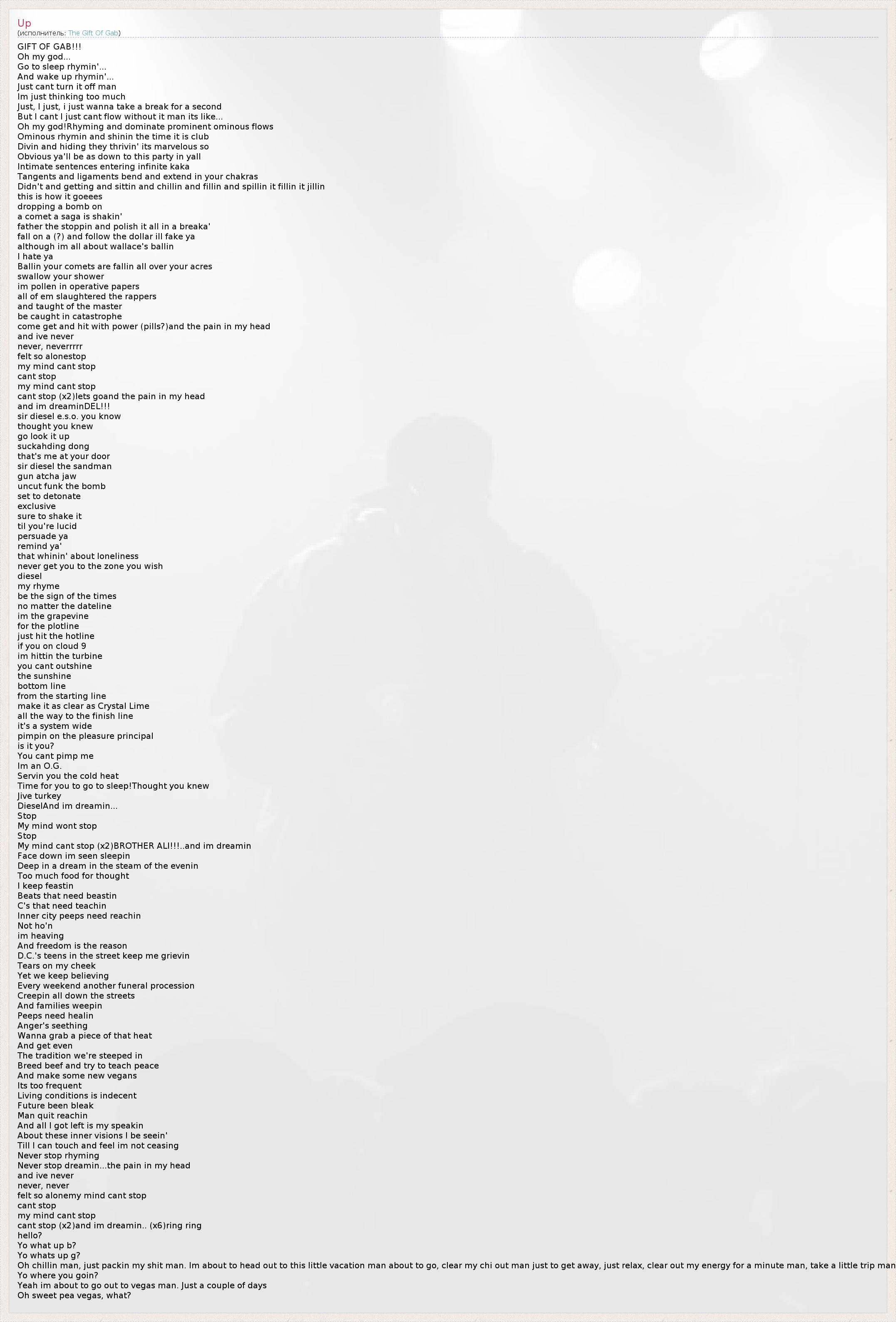 GIFT OF GAB!!! Oh my god... Go to sleep rhymin'... And wake up rhymin'... Just cant turn it off man Im just thinking too much Just, I just, i just wanna take a break for a second But I cant I just cant flow without it man its like... Oh my god!Rhyming and dominate prominent ominous flows Ominous rhymin and shinin the time it is club Divin and hiding they thrivin' its marvelous so Obvious ya'll be as down to this party in yall Intimate sentences entering infinite kaka Tangents and ligaments bend and extend in your chakras Didn't and getting and sittin and chillin and fillin and spillin it fillin it jillin this is how it goeees dropping a bomb on a comet a saga is shakin' father the stoppin and polish it all in a breaka' fall on a (?) and follow the dollar ill fake ya although im all about wallace's ballin I hate ya Ballin your comets are fallin all over your acres swallow your shower im pollen in operative papers all of em slaughtered the rappers and taught of the master be caught in catastrophe come get and hit with power (pills?)and the pain in my head and ive never never, neverrrrr felt so alonestop my mind cant stop cant stop my mind cant stop cant stop (x2)lets goand the pain in my head and im dreaminDEL!!! sir diesel e.s.o. you know thought you knew go look it up suckahding dong that's me at your door sir diesel the sandman gun atcha jaw uncut funk the bomb set to detonate exclusive sure to shake it til you're lucid persuade ya remind ya' that whinin' about loneliness never get you to the zone you wish diesel my rhyme be the sign of the times no matter the dateline im the grapevine for the plotline just hit the hotline if you on cloud 9 im hittin the turbine you cant outshine the sunshine bottom line from the starting line make it as clear as Crystal Lime all the way to the finish line it's a system wide pimpin on the pleasure principal is it you? You cant pimp me Im an O.G. Servin you the cold heat Time for you to go to sleep!Thought you knew Jive turkey DieselAnd im dreamin... Stop My mind wont stop Stop My mind cant stop (x2)BROTHER ALI!!!..and im dreamin Face down im seen sleepin Deep in a dream in the steam of the evenin Too much food for thought I keep feastin Beats that need beastin C's that need teachin Inner city peeps need reachin Not ho'n im heaving And freedom is the reason D.C.'s teens in the street keep me grievin Tears on my cheek Yet we keep believing Every weekend another funeral procession Creepin all down the streets And families weepin Peeps need healin Anger's seething Wanna grab a piece of that heat And get even The tradition we're steeped in Breed beef and try to teach peace And make some new vegans Its too frequent Living conditions is indecent Future been bleak Man quit reachin And all I got left is my speakin About these inner visions I be seein' Till I can touch and feel im not ceasing Never stop rhyming Never stop dreamin...the pain in my head and ive never never, never felt so alonemy mind cant stop cant stop my mind cant stop cant stop (x2)and im dreamin.. (x6)ring ring hello? Yo what up b? Yo whats up g? Oh chillin man, just packin my shit man. Im about to head out to this little vacation man about to go, clear my chi out man just to get away, just relax, clear out my energy for a minute man, take a little trip man Yo where you goin? Yeah im about to go out to vegas man. Just a couple of days Oh sweet pea vegas, what?