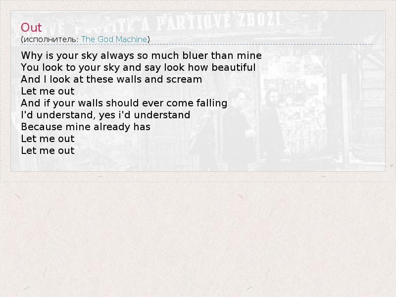 Why is your sky always so much bluer than mine You look to your sky and say look how beautiful And I look at these walls and scream Let me out And if your walls should ever come falling I'd understand, yes i'd understand Because mine already has Let me out Let me out