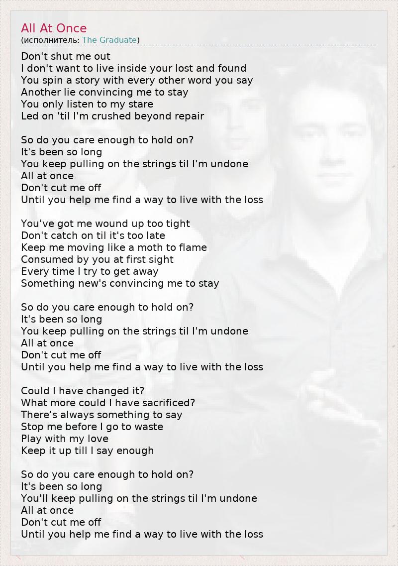 Don't shut me out I don't want to live inside your lost and found You spin a story with every other word you say Another lie convincing me to stay You only listen to my stare Led on 'til I'm crushed beyond repair So do you care enough to hold on? It's been so long You keep pulling on the strings til I'm undone All at once Don't cut me off Until you help me find a way to live with the loss You've got me wound up too tight Don't catch on til it's too late Keep me moving like a moth to flame Consumed by you at first sight Every time I try to get away Something new's convincing me to stay So do you care enough to hold on? It's been so long You keep pulling on the strings til I'm undone All at once Don't cut me off Until you help me find a way to live with the loss Could I have changed it? What more could I have sacrificed? There's always something to say Stop me before I go to waste Play with my love Keep it up till I say enough So do you care enough to hold on? It's been so long You'll keep pulling on the strings til I'm undone All at once Don't cut me off Until you help me find a way to live with the loss