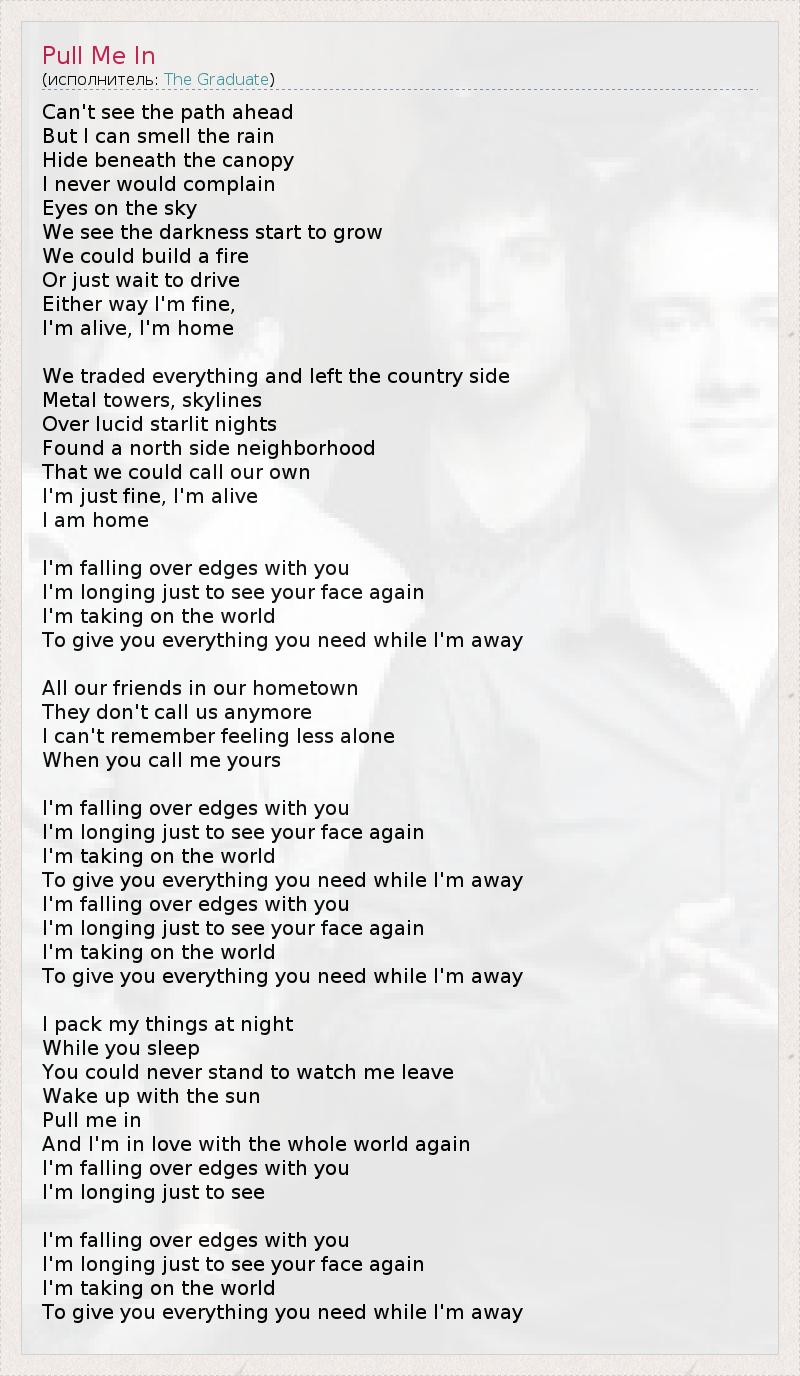 Не вижу путь вперед Но я чувствую запах дождя Скрыть под навесом Я бы никогда не жалуются Глаза на небо Мы видим,тьма начинают расти Мы могли бы построить огонь Или просто ждать, чтобы проехать В любом случае я в порядке , Я жив , я дома Мы торговали все и оставил село Металлические башни, пейзажей За ясные звездные ночи Нашли северо -Сайд города То, что мы могли бы назвать наш собственный Я просто прекрасно, я жив Я дома Я падаю , по краям с вами Я жажду , чтобы посмотреть ваше лицо снова Я принимаю на мир Чтобы дать вам все, что вам нужно , а я далеко Все наши друзья в нашем родном городе Они не называют нас больше Я не могу вспомнить чувство менее одиноким Когда вы вызываете мне свой Я падаю , по краям с вами Я жажду , чтобы посмотреть ваше лицо снова Я принимаю на мир Чтобы дать вам все, что вам нужно , а я далеко Я падаю , по краям с вами Я жажду , чтобы посмотреть ваше лицо снова Я принимаю на мир Чтобы дать вам все, что вам нужно , а я далеко Я пакую вещи ночью Пока вы спите Вы никогда не могли стоять смотреть, как я оставить Просыпайтесь с солнцем Потяните меня в А я в любви со всем миром снова Я падаю , по краям с вами Я жажду , чтобы посмотреть, Я падаю , по краям с вами Я жажду , чтобы посмотреть ваше лицо снова Я принимаю на мир Чтобы дать вам все, что вам нужно , а я далеко