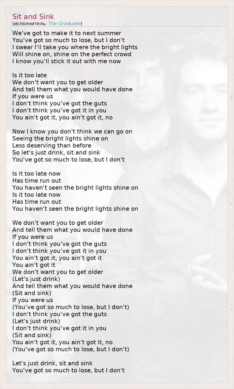 We've got to make it to next summer You've got so much to lose, but I don't I swear I'll take you where the bright lights Will shine on, shine on the perfect crowd I know you'll stick it out with me now Is it too late We don't want you to get older And tell them what you would have done If you were us I don't think you've got the guts I don't think you've got it in you You ain't got it, you ain't got it, no Now I know you don't think we can go on Seeing the bright lights shine on Less deserving than before So let's just drink, sit and sink You've got so much to lose, but I don't Is it too late now Has time run out You haven't seen the bright lights shine on Is it too late now Has time run out You haven't seen the bright lights shine on We don't want you to get older And tell them what you would have done If you were us I don't think you've got the guts I don't think you've got it in you You ain't got it, you ain't got it You ain't got it We don't want you to get older (Let's just drink) And tell them what you would have done (Sit and sink) If you were us (You've got so much to lose, but I don't) I don't think you've got the guts (Let's just drink) I don't think you've got it in you (Sit and sink) You ain't got it, you ain't got it, no (You've got so much to lose, but I don't) Let's just drink, sit and sink You've got so much to lose, but I don't