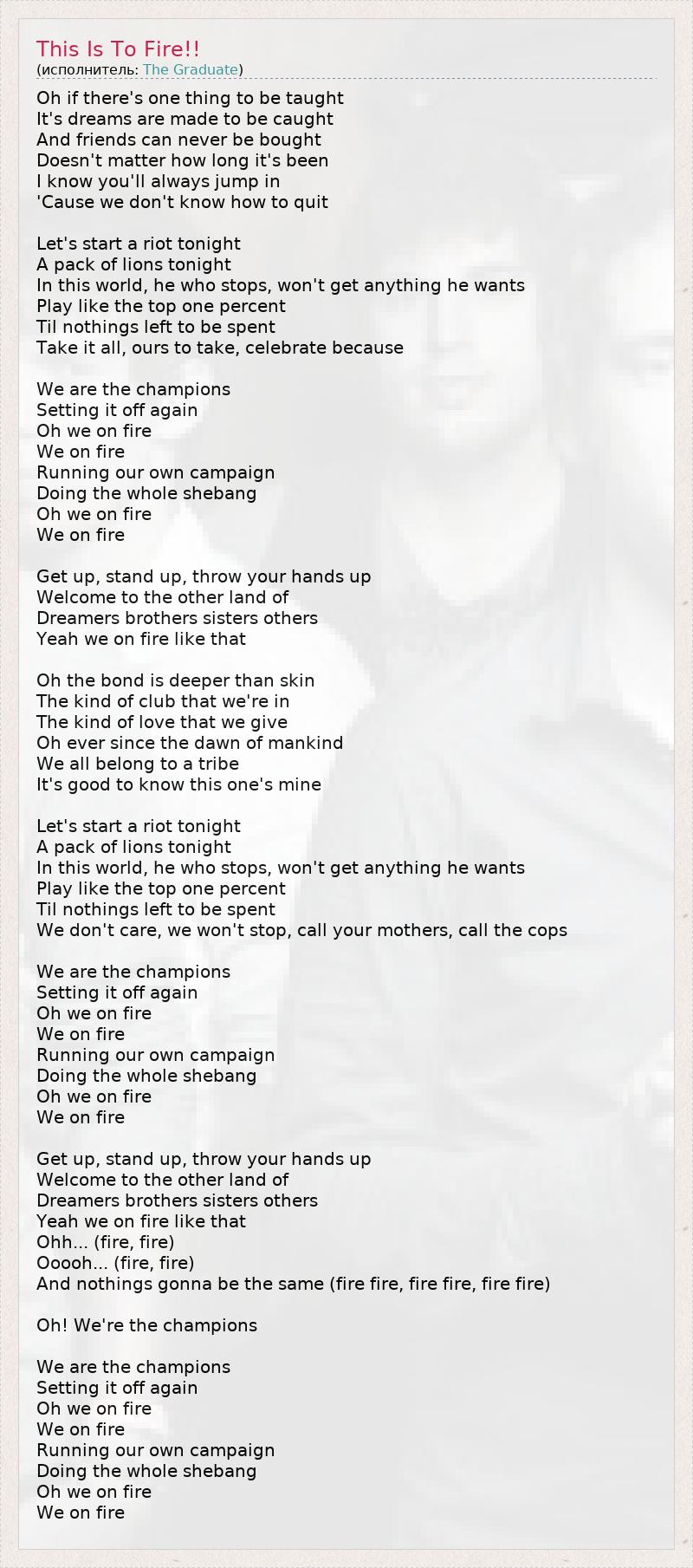 Oh if there's one thing to be taught It's dreams are made to be caught And friends can never be bought Doesn't matter how long it's been I know you'll always jump in 'Cause we don't know how to quit Let's start a riot tonight A pack of lions tonight In this world, he who stops, won't get anything he wants Play like the top one percent Til nothings left to be spent Take it all, ours to take, celebrate because We are the champions Setting it off again Oh we on fire We on fire Running our own campaign Doing the whole shebang Oh we on fire We on fire Get up, stand up, throw your hands up Welcome to the other land of Dreamers brothers sisters others Yeah we on fire like that Oh the bond is deeper than skin The kind of club that we're in The kind of love that we give Oh ever since the dawn of mankind We all belong to a tribe It's good to know this one's mine Let's start a riot tonight A pack of lions tonight In this world, he who stops, won't get anything he wants Play like the top one percent Til nothings left to be spent We don't care, we won't stop, call your mothers, call the cops We are the champions Setting it off again Oh we on fire We on fire Running our own campaign Doing the whole shebang Oh we on fire We on fire Get up, stand up, throw your hands up Welcome to the other land of Dreamers brothers sisters others Yeah we on fire like that Ohh... (fire, fire) Ooooh... (fire, fire) And nothings gonna be the same (fire fire, fire fire, fire fire) Oh! We're the champions We are the champions Setting it off again Oh we on fire We on fire Running our own campaign Doing the whole shebang Oh we on fire We on fire