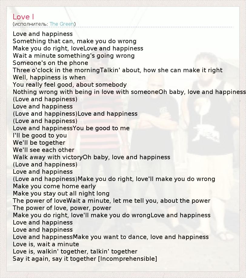 Love and happiness Something that can, make you do wrong Make you do right, loveLove and happiness Wait a minute something's going wrong Someone's on the phone Three o'clock in the morningTalkin' about, how she can make it right Well, happiness is when You really feel good, about somebody Nothing wrong with being in love with someoneOh baby, love and happiness (Love and happiness) Love and happiness (Love and happiness)Love and happiness (Love and happiness) Love and happinessYou be good to me I'll be good to you We'll be together We'll see each other Walk away with victoryOh baby, love and happiness (Love and happiness) Love and happiness (Love and happiness)Make you do right, love'll make you do wrong Make you come home early Make you stay out all night long The power of loveWait a minute, let me tell you, about the power The power of love, power, power Make you do right, love'll make you do wrongLove and happiness Love and happiness Love and happiness Love and happinessMake you want to dance, love and happiness Love is, wait a minute Love is, walkin' together, talkin' together Say it again, say it together [Incomprehensible]