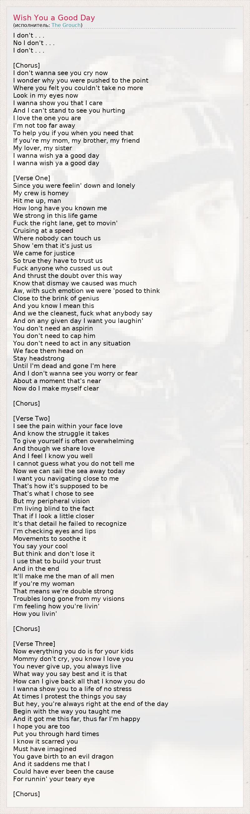 I don't . . . No I don't . . . I don't . . . [Chorus] I don't wanna see you cry now I wonder why you were pushed to the point Where you felt you couldn't take no more Look in my eyes now I wanna show you that I care And I can't stand to see you hurting I love the one you are I'm not too far away To help you if you when you need that If you're my mom, my brother, my friend My lover, my sister I wanna wish ya a good day I wanna wish ya a good day [Verse One] Since you were feelin' down and lonely My crew is homey Hit me up, man How long have you known me We strong in this life game Fuck the right lane, get to movin' Cruising at a speed Where nobody can touch us Show 'em that it's just us We came for justice So true they have to trust us Fuck anyone who cussed us out And thrust the doubt over this way Know that dismay we caused was much Aw, with such emotion we were 'posed to think Close to the brink of genius And you know I mean this And we the cleanest, fuck what anybody say And on any given day I want you laughin' You don't need an aspirin You don't need to cap him You don't need to act in any situation We face them head on Stay headstrong Until I'm dead and gone I'm here And I don't wanna see you worry or fear About a moment that's near Now do I make myself clear [Chorus] [Verse Two] I see the pain within your face love And know the struggle it takes To give yourself is often overwhelming And though we share love And I feel I know you well I cannot guess what you do not tell me Now we can sail the sea away today I want you navigating close to me That's how it's supposed to be That's what I chose to see But my peripheral vision I'm living blind to the fact That if I look a little closer It's that detail he failed to recognize I'm checking eyes and lips Movements to soothe it You say your cool But think and don't lose it I use that to build your trust And in the end It'll make me the man of all men If you're my woman That means we're double strong Troubles long gone from my visions I'm feeling how you're livin' How you livin' [Chorus] [Verse Three] Now everything you do is for your kids Mommy don't cry, you know I love you You never give up, you always live What way you say best and it is that How can I give back all that I know you do I wanna show you to a life of no stress At times I protest the things you say But hey, you're always right at the end of the day Begin with the way you taught me And it got me this far, thus far I'm happy I hope you are too Put you through hard times I know it scarred you Must have imagined You gave birth to an evil dragon And it saddens me that I Could have ever been the cause For runnin' your teary eye [Chorus]