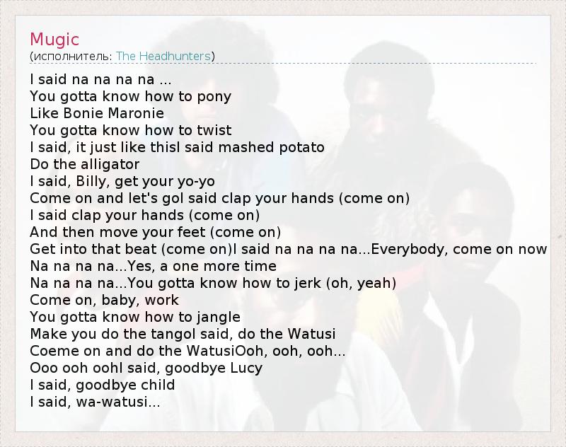I said na na na na ... You gotta know how to pony Like Bonie Maronie You gotta know how to twist I said, it just like thisI said mashed potato Do the alligator I said, Billy, get your yo-yo Come on and let's goI said clap your hands (come on) I said clap your hands (come on) And then move your feet (come on) Get into that beat (come on)I said na na na na...Everybody, come on now Na na na na...Yes, a one more time Na na na na...You gotta know how to jerk (oh, yeah) Come on, baby, work You gotta know how to jangle Make you do the tangoI said, do the Watusi Coeme on and do the WatusiOoh, ooh, ooh... Ooo ooh oohI said, goodbye Lucy I said, goodbye child I said, wa-watusi...