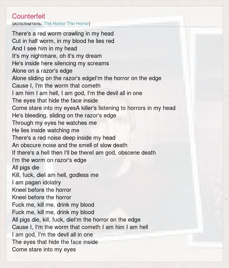 There's a red worm crawling in my head Cut in half worm, in my blood he lies red And I see him in my head It's my nightmare, oh it's my dream He's inside here silencing my screams Alone on a razor's edge Alone sliding on the razor's edgeI'm the horror on the edge Cause I, I'm the worm that cometh I am him I am hell, I am god, I'm the devil all in one The eyes that hide the face inside Come stare into my eyesA killer's listening to horrors in my head He's bleeding, sliding on the razor's edge Through my eyes he watches me He lies inside watching me There's a red noise deep inside my head An obscure noise and the smell of slow death If there's a hell then I'll be thereI am god, obscene death I'm the worm on razor's edge All pigs die Kill, fuck, dieI am hell, godless me I am pagan idolatry Kneel before the horror Kneel before the horror Fuck me, kill me, drink my blood Fuck me, kill me, drink my blood All pigs die, kill, fuck, dieI'm the horror on the edge Cause I, I'm the worm that cometh I am him I am hell I am god, I'm the devil all in one The eyes that hide the face inside Come stare into my eyes