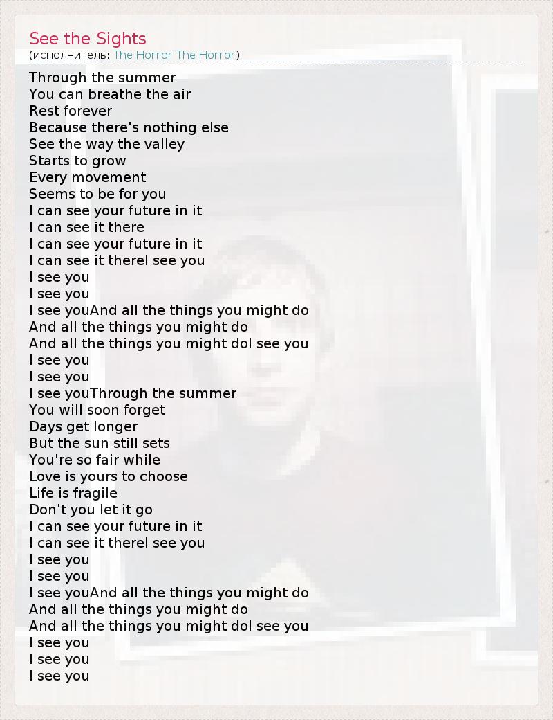 Through the summer You can breathe the air Rest forever Because there's nothing else See the way the valley Starts to grow Every movement Seems to be for you I can see your future in it I can see it there I can see your future in it I can see it thereI see you I see you I see you I see youAnd all the things you might do And all the things you might do And all the things you might doI see you I see you I see you I see youThrough the summer You will soon forget Days get longer But the sun still sets You're so fair while Love is yours to choose Life is fragile Don't you let it go I can see your future in it I can see it thereI see you I see you I see you I see youAnd all the things you might do And all the things you might do And all the things you might doI see you I see you I see you I see you