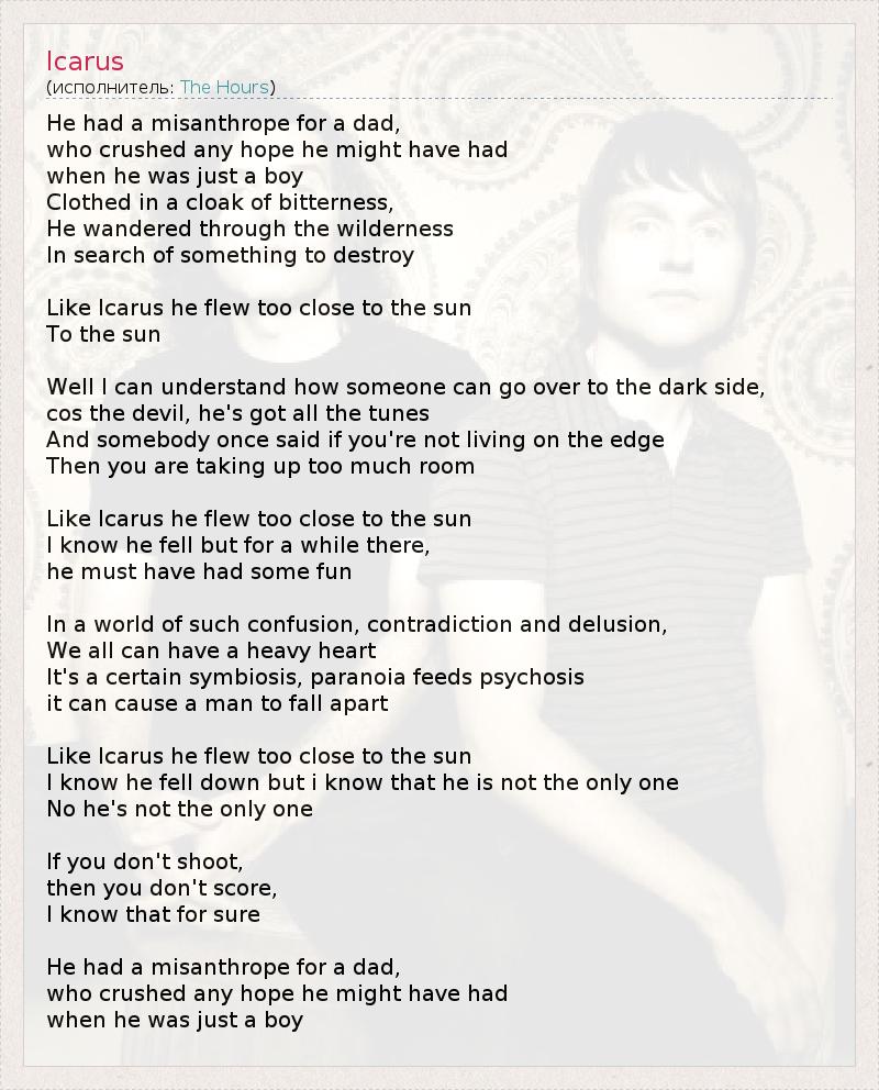 He had a misanthrope for a dad, who crushed any hope he might have had when he was just a boy Clothed in a cloak of bitterness, He wandered through the wilderness In search of something to destroy Like Icarus he flew too close to the sun To the sun Well I can understand how someone can go over to the dark side, cos the devil, he's got all the tunes And somebody once said if you're not living on the edge Then you are taking up too much room Like Icarus he flew too close to the sun I know he fell but for a while there, he must have had some fun In a world of such confusion, contradiction and delusion, We all can have a heavy heart It's a certain symbiosis, paranoia feeds psychosis it can cause a man to fall apart Like Icarus he flew too close to the sun I know he fell down but i know that he is not the only one No he's not the only one If you don't shoot, then you don't score, I know that for sure He had a misanthrope for a dad, who crushed any hope he might have had when he was just a boy