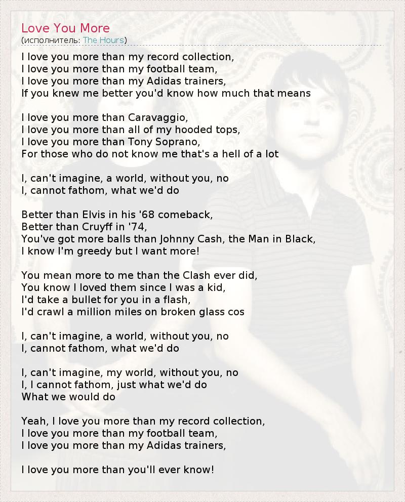 I love you more than my record collection, I love you more than my football team, I love you more than my Adidas trainers, If you knew me better you'd know how much that means I love you more than Caravaggio, I love you more than all of my hooded tops, I love you more than Tony Soprano, For those who do not know me that's a hell of a lot I, can't imagine, a world, without you, no I, cannot fathom, what we'd do Better than Elvis in his '68 comeback, Better than Cruyff in '74, You've got more balls than Johnny Cash, the Man in Black, I know I'm greedy but I want more! You mean more to me than the Clash ever did, You know I loved them since I was a kid, I'd take a bullet for you in a flash, I'd crawl a million miles on broken glass cos I, can't imagine, a world, without you, no I, cannot fathom, what we'd do I, can't imagine, my world, without you, no I, I cannot fathom, just what we'd do What we would do Yeah, I love you more than my record collection, I love you more than my football team, I love you more than my Adidas trainers, I love you more than you'll ever know!