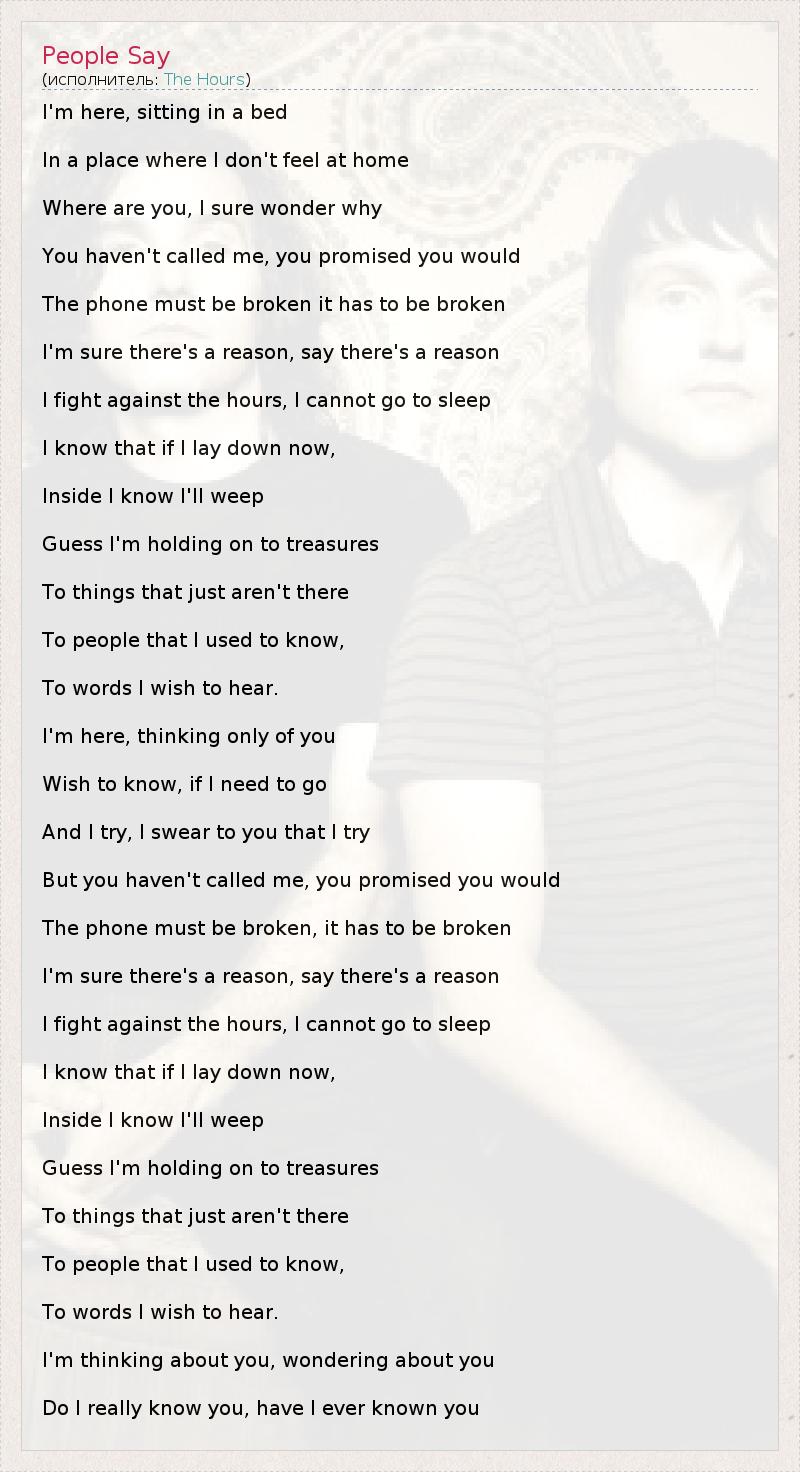 I'm here, sitting in a bed In a place where I don't feel at home Where are you, I sure wonder why You haven't called me, you promised you would The phone must be broken it has to be broken I'm sure there's a reason, say there's a reason I fight against the hours, I cannot go to sleep I know that if I lay down now, Inside I know I'll weep Guess I'm holding on to treasures To things that just aren't there To people that I used to know, To words I wish to hear. I'm here, thinking only of you Wish to know, if I need to go And I try, I swear to you that I try But you haven't called me, you promised you would The phone must be broken, it has to be broken I'm sure there's a reason, say there's a reason I fight against the hours, I cannot go to sleep I know that if I lay down now, Inside I know I'll weep Guess I'm holding on to treasures To things that just aren't there To people that I used to know, To words I wish to hear. I'm thinking about you, wondering about you Do I really know you, have I ever known you