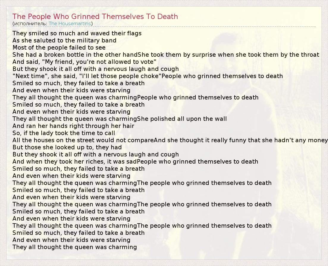 They smiled so much and waved their flags As she saluted to the military band Most of the people failed to see She had a broken bottle in the other handShe took them by surprise when she took them by the throat And said, "My friend, you're not allowed to vote" But they shook it all off with a nervous laugh and cough "Next time", she said, "I'll let those people choke"People who grinned themselves to death Smiled so much, they failed to take a breath And even when their kids were starving They all thought the queen was charmingPeople who grinned themselves to death Smiled so much, they failed to take a breath And even when their kids were starving They all thought the queen was charmingShe polished all upon the wall And ran her hands right through her hair So, if the lady took the time to call All the houses on the street would not compareAnd she thought it really funny that she hadn't any money But those she looked up to, they had But they shook it all off with a nervous laugh and cough And when they took her riches, it was sadPeople who grinned themselves to death Smiled so much, they failed to take a breath And even when their kids were starving They all thought the queen was charmingThe people who grinned themselves to death Smiled so much, they failed to take a breath And even when their kids were starving They all thought the queen was charmingThe people who grinned themselves to death Smiled so much, they failed to take a breath And even when their kids were starving They all thought the queen was charmingThe people who grinned themselves to death Smiled so much, they failed to take a breath And even when their kids were starving They all thought the queen was charming