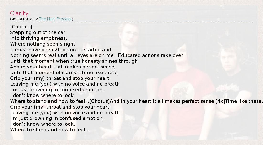 [Chorus:] Stepping out of the car Into thriving emptiness, Where nothing seems right. It must have been 20 before it started and Nothing seems real until all eyes are on me...Educated actions take over Until that moment when true honesty shines through And in your heart it all makes perfect sense, Until that moment of clarity...Time like these, Grip your (my) throat and stop your heart Leaving me (you) with no voice and no breath I'm just drowning in confused emotion, I don't know where to look, Where to stand and how to feel...[Chorus]And in your heart it all makes perfect sense [4x]Time like these, Grip your (my) throat and stop your heart Leaving me (you) with no voice and no breath I'm just drowning in confused emotion, I don't know where to look, Where to stand and how to feel...