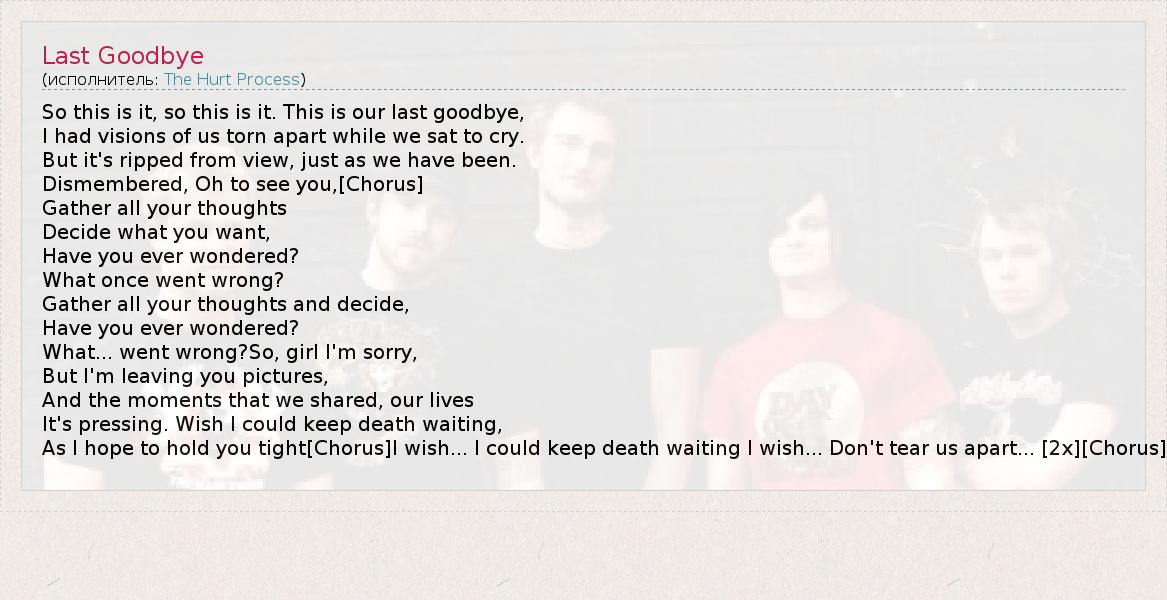 So this is it, so this is it. This is our last goodbye, I had visions of us torn apart while we sat to cry. But it's ripped from view, just as we have been. Dismembered, Oh to see you,[Chorus] Gather all your thoughts Decide what you want, Have you ever wondered? What once went wrong? Gather all your thoughts and decide, Have you ever wondered? What... went wrong?So, girl I'm sorry, But I'm leaving you pictures, And the moments that we shared, our lives It's pressing. Wish I could keep death waiting, As I hope to hold you tight[Chorus]I wish... I could keep death waiting I wish... Don't tear us apart... [2x][Chorus]