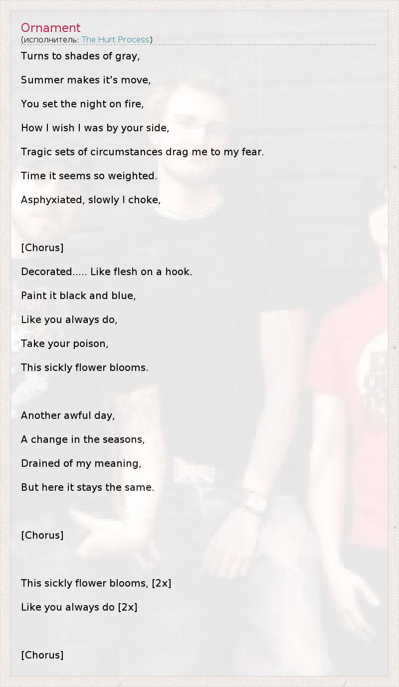 Turns to shades of gray, Summer makes it's move, You set the night on fire, How I wish I was by your side, Tragic sets of circumstances drag me to my fear. Time it seems so weighted. Asphyxiated, slowly I choke, [Chorus] Decorated..... Like flesh on a hook. Paint it black and blue, Like you always do, Take your poison, This sickly flower blooms. Another awful day, A change in the seasons, Drained of my meaning, But here it stays the same. [Chorus] This sickly flower blooms, [2x] Like you always do [2x] [Chorus]