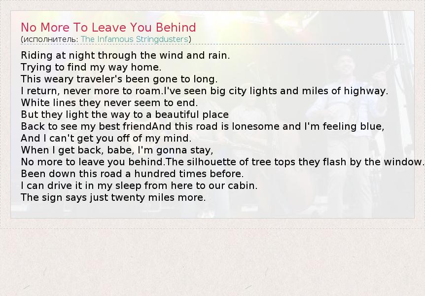 А как ты думаешь, о чем песня "No More To Leave You Behind" ?