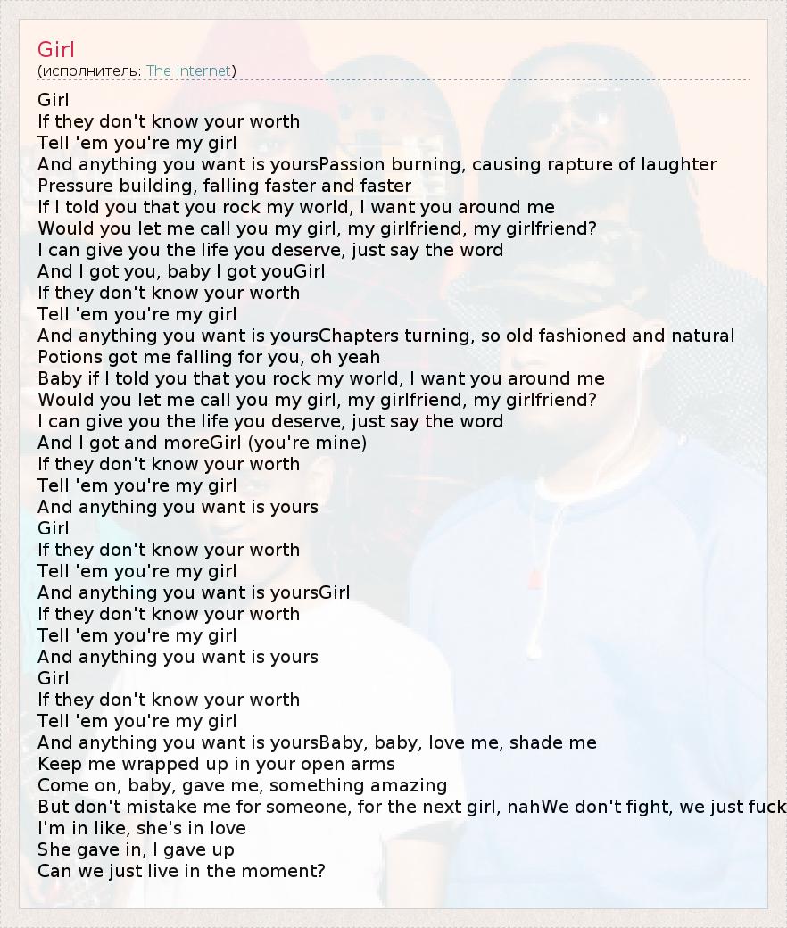 Girl If they don't know your worth Tell 'em you're my girl And anything you want is yoursPassion burning, causing rapture of laughter Pressure building, falling faster and faster If I told you that you rock my world, I want you around me Would you let me call you my girl, my girlfriend, my girlfriend? I can give you the life you deserve, just say the word And I got you, baby I got youGirl If they don't know your worth Tell 'em you're my girl And anything you want is yoursChapters turning, so old fashioned and natural Potions got me falling for you, oh yeah Baby if I told you that you rock my world, I want you around me Would you let me call you my girl, my girlfriend, my girlfriend? I can give you the life you deserve, just say the word And I got and moreGirl (you're mine) If they don't know your worth Tell 'em you're my girl And anything you want is yours Girl If they don't know your worth Tell 'em you're my girl And anything you want is yoursGirl If they don't know your worth Tell 'em you're my girl And anything you want is yours Girl If they don't know your worth Tell 'em you're my girl And anything you want is yoursBaby, baby, love me, shade me Keep me wrapped up in your open arms Come on, baby, gave me, something amazing But don't mistake me for someone, for the next girl, nahWe don't fight, we just fuck I'm in like, she's in love She gave in, I gave up Can we just live in the moment?