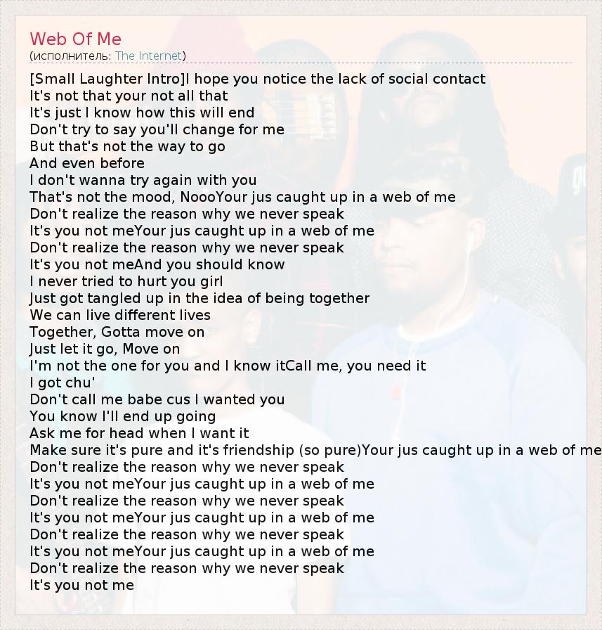 [Small Laughter Intro]I hope you notice the lack of social contact It's not that your not all that It's just I know how this will end Don't try to say you'll change for me But that's not the way to go And even before I don't wanna try again with you That's not the mood, NoooYour jus caught up in a web of me Don't realize the reason why we never speak It's you not meYour jus caught up in a web of me Don't realize the reason why we never speak It's you not meAnd you should know I never tried to hurt you girl Just got tangled up in the idea of being together We can live different lives Together, Gotta move on Just let it go, Move on I'm not the one for you and I know itCall me, you need it I got chu' Don't call me babe cus I wanted you You know I'll end up going Ask me for head when I want it Make sure it's pure and it's friendship (so pure)Your jus caught up in a web of me Don't realize the reason why we never speak It's you not meYour jus caught up in a web of me Don't realize the reason why we never speak It's you not meYour jus caught up in a web of me Don't realize the reason why we never speak It's you not meYour jus caught up in a web of me Don't realize the reason why we never speak It's you not me