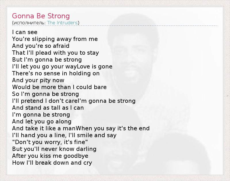 I can see You're slipping away from me And you're so afraid That I'll plead with you to stay But I'm gonna be strong I'll let you go your wayLove is gone There's no sense in holding on And your pity now Would be more than I could bare So I'm gonna be strong I'll pretend I don't careI'm gonna be strong And stand as tall as I can I'm gonna be strong And let you go along And take it like a manWhen you say it's the end I'll hand you a line, I'll smile and say "Don't you worry, it's fine" But you'll never know darling After you kiss me goodbye How I'll break down and cry