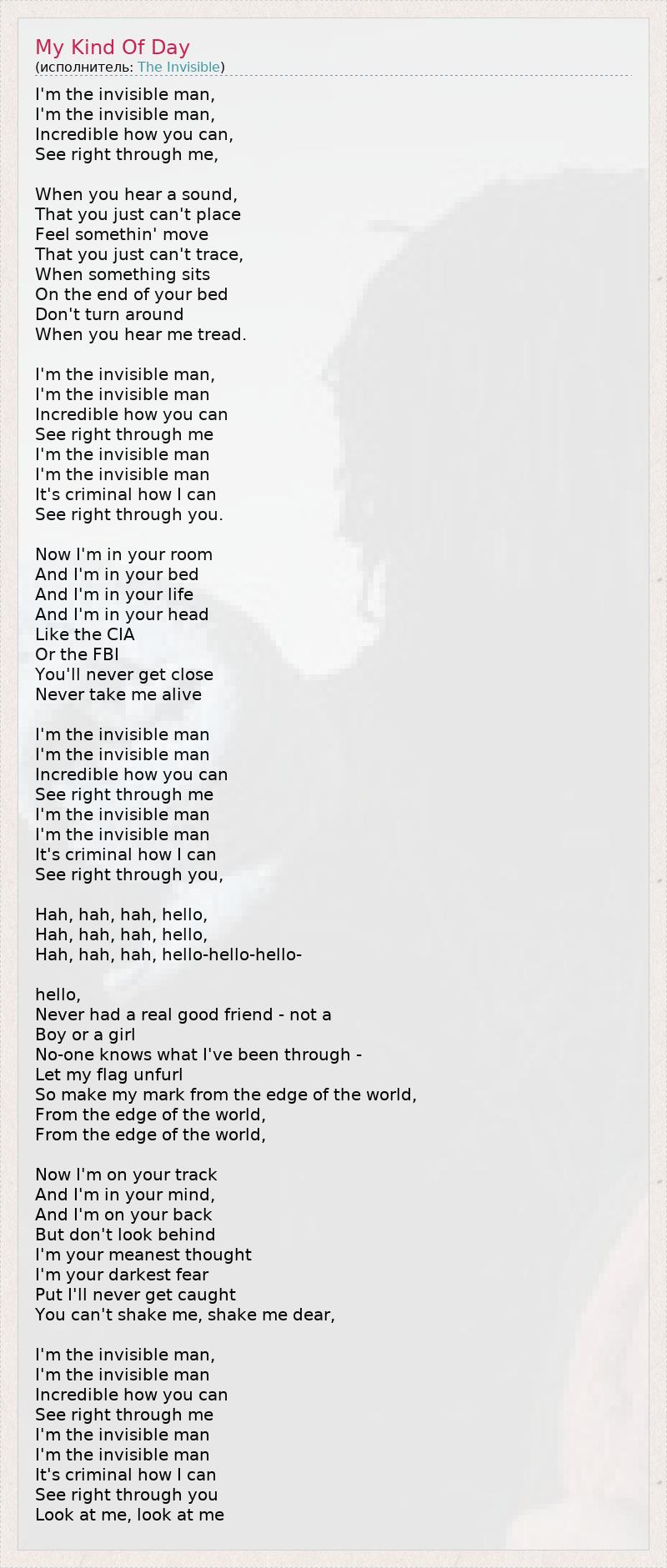 Я - человек-невидимка, Я - человек-невидимка, Удивительно, как ты можешь Видеть меня насквозь. Когда ты слышишь звук, Но не можешь понять, откуда он, Ощущаешь какое-то движение, Которое невозможно проследить, Когда что-то сидит В ногах твоей кровати, Не оборачивайся, Когда слышишь мою поступь. Я - человек-невидимка, Я - человек-невидимка, Удивительно, как ты можешь Видеть меня насквозь. Я - человек-невидимка, Я - человек-невидимка, Неправильно то, что я Могу видеть тебя насквозь. Теперь я - в твоей комнате И в твоей кровати, И в твоей жизни, И в твоей голове, Как ЦРУ Или ФБР, Тебе никогда приблизиться ко мне И никогда не схватить меня живым. Я - человек-невидимка, Я - человек-невидимка, Удивительно, как ты можешь Видеть меня насквозь. Я - человек-невидимка, Я - человек-невидимка, Неправильно то, что я Могу видеть тебя насквозь. Эй, эй, эй, привет, Эй, эй, эй, привет, Эй, эй, эй, привет-привет-привет... Привет, У меня никогда не было настоящего друга - Ни среди мальчиков, ни среди девочек, Никто не знает, через что мне пришлось пройти - Так позволь мне развернуть мой флаг, Чтобы пометить свою территорию От края Земли, От края Земли. Теперь я - на твоём пути И в твоих мыслях, И я у тебя за спиной, Только не оборачивайся. Я - твоя самая злая мысль, Я - твой самый тёмный страх, Но меня не поймать, Я не поколебим, нет, мой друг. Я - человек-невидимка, Я - человек-невидимка, Удивительно, как ты можешь Видеть меня насквозь. Я - человек-невидимка, Я - человек-невидимка, Неправильно то, что я Могу видеть тебя насквозь. Взгляни на меня, ну же, взгляни на меня.