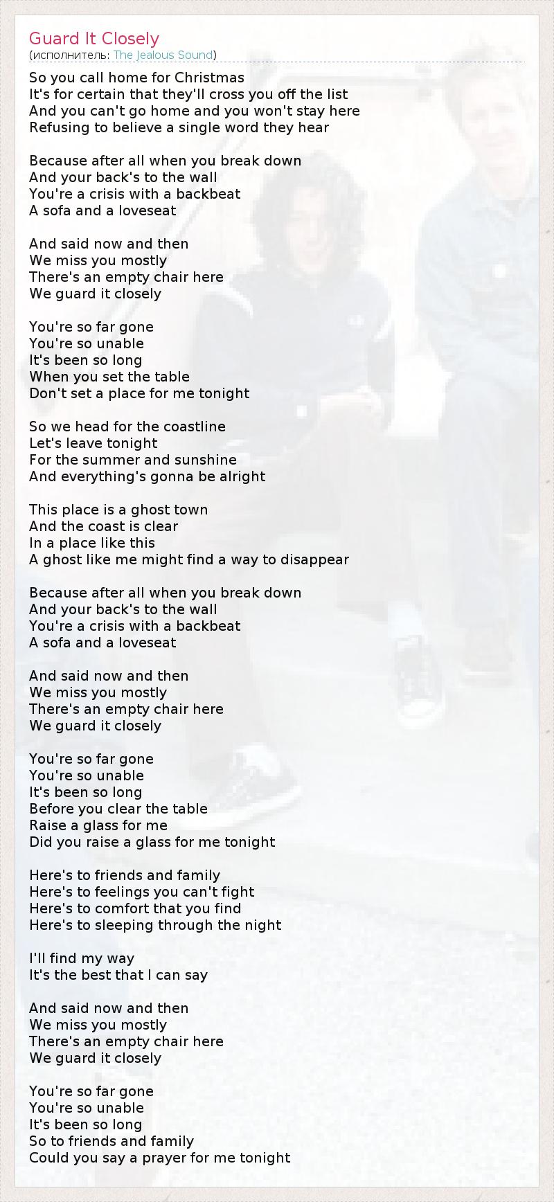 So you call home for Christmas It's for certain that they'll cross you off the list And you can't go home and you won't stay here Refusing to believe a single word they hear Because after all when you break down And your back's to the wall You're a crisis with a backbeat A sofa and a loveseat And said now and then We miss you mostly There's an empty chair here We guard it closely You're so far gone You're so unable It's been so long When you set the table Don't set a place for me tonight So we head for the coastline Let's leave tonight For the summer and sunshine And everything's gonna be alright This place is a ghost town And the coast is clear In a place like this A ghost like me might find a way to disappear Because after all when you break down And your back's to the wall You're a crisis with a backbeat A sofa and a loveseat And said now and then We miss you mostly There's an empty chair here We guard it closely You're so far gone You're so unable It's been so long Before you clear the table Raise a glass for me Did you raise a glass for me tonight Here's to friends and family Here's to feelings you can't fight Here's to comfort that you find Here's to sleeping through the night I'll find my way It's the best that I can say And said now and then We miss you mostly There's an empty chair here We guard it closely You're so far gone You're so unable It's been so long So to friends and family Could you say a prayer for me tonight
