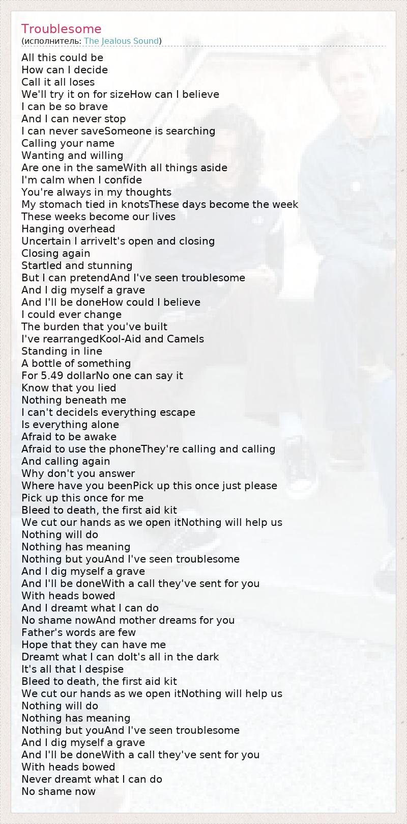 All this could be How can I decide Call it all loses We'll try it on for sizeHow can I believe I can be so brave And I can never stop I can never saveSomeone is searching Calling your name Wanting and willing Are one in the sameWith all things aside I'm calm when I confide You're always in my thoughts My stomach tied in knotsThese days become the week These weeks become our lives Hanging overhead Uncertain I arriveIt's open and closing Closing again Startled and stunning But I can pretendAnd I've seen troublesome And I dig myself a grave And I'll be doneHow could I believe I could ever change The burden that you've built I've rearrangedKool-Aid and Camels Standing in line A bottle of something For 5.49 dollarNo one can say it Know that you lied Nothing beneath me I can't decideIs everything escape Is everything alone Afraid to be awake Afraid to use the phoneThey're calling and calling And calling again Why don't you answer Where have you beenPick up this once just please Pick up this once for me Bleed to death, the first aid kit We cut our hands as we open itNothing will help us Nothing will do Nothing has meaning Nothing but youAnd I've seen troublesome And I dig myself a grave And I'll be doneWith a call they've sent for you With heads bowed And I dreamt what I can do No shame nowAnd mother dreams for you Father's words are few Hope that they can have me Dreamt what I can doIt's all in the dark It's all that I despise Bleed to death, the first aid kit We cut our hands as we open itNothing will help us Nothing will do Nothing has meaning Nothing but youAnd I've seen troublesome And I dig myself a grave And I'll be doneWith a call they've sent for you With heads bowed Never dreamt what I can do No shame now