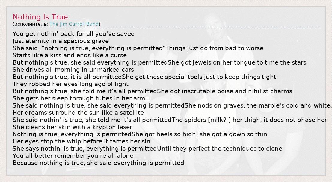 She said nothing is true, she said everything is permittedShe nods on graves, the marble's cold and white,