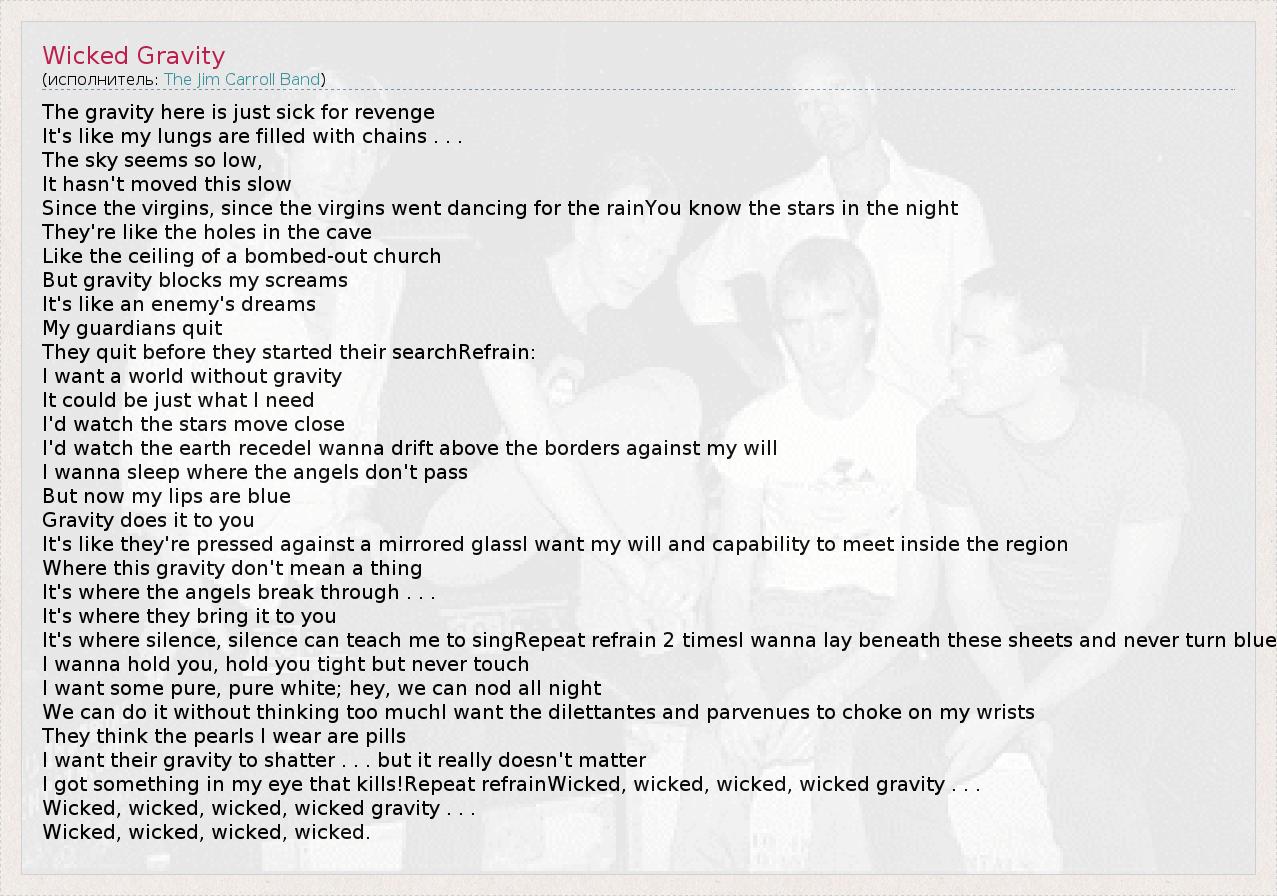 The gravity here is just sick for revenge It's like my lungs are filled with chains . . . The sky seems so low, It hasn't moved this slow Since the virgins, since the virgins went dancing for the rainYou know the stars in the night They're like the holes in the cave Like the ceiling of a bombed-out church But gravity blocks my screams It's like an enemy's dreams My guardians quit They quit before they started their searchRefrain: I want a world without gravity It could be just what I need I'd watch the stars move close I'd watch the earth recedeI wanna drift above the borders against my will I wanna sleep where the angels don't pass But now my lips are blue Gravity does it to you It's like they're pressed against a mirrored glassI want my will and capability to meet inside the region Where this gravity don't mean a thing It's where the angels break through . . . It's where they bring it to you It's where silence, silence can teach me to singRepeat refrain 2 timesI wanna lay beneath these sheets and never turn blue I wanna hold you, hold you tight but never touch I want some pure, pure white; hey, we can nod all night We can do it without thinking too muchI want the dilettantes and parvenues to choke on my wrists They think the pearls I wear are pills I want their gravity to shatter . . . but it really doesn't matter I got something in my eye that kills!Repeat refrainWicked, wicked, wicked, wicked gravity . . . Wicked, wicked, wicked, wicked gravity . . . Wicked, wicked, wicked, wicked.