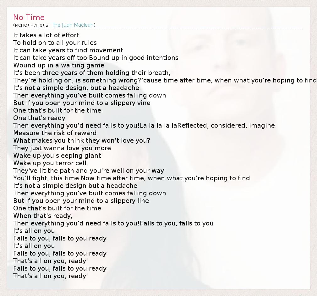 It takes a lot of effort To hold on to all your rules It can take years to find movement It can take years off too.Bound up in good intentions Wound up in a waiting game It's been three years of them holding their breath, They're holding on, is something wrong?'cause time after time, when what you're hoping to find It's not a simple design, but a headache Then everything you've built comes falling down But if you open your mind to a slippery vine One that's built for the time One that's ready Then everything you'd need falls to you!La la la la laReflected, considered, imagine Measure the risk of reward What makes you think they won't love you? They just wanna love you more Wake up you sleeping giant Wake up you terror cell They've lit the path and you're well on your way You'll fight, this time.Now time after time, when what you're hoping to find It's not a simple design but a headache Then everything you've built comes falling down But if you open your mind to a slippery line One that's built for the time When that's ready, Then everything you'd need falls to you!Falls to you, falls to you It's all on you Falls to you, falls to you ready It's all on you Falls to you, falls to you ready That's all on you, ready Falls to you, falls to you ready That's all on you, ready