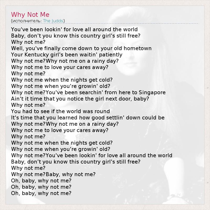 You've been lookin' for love all around the world Baby, don't you know this country girl's still free? Why not me? Well, you've finally come down to your old hometown Your Kentucky girl's been waitin' patiently Why not me?Why not me on a rainy day? Why not me to love your cares away? Why not me? Why not me when the nights get cold? Why not me when you're growin' old? Why not me?You've been searchin' from here to Singapore Ain't it time that you notice the girl next door, baby? Why not me? You had to see if the world was round It's time that you learned how good settlin' down could be Why not me?Why not me on a rainy day? Why not me to love your cares away? Why not me? Why not me when the nights get cold? Why not me when you're growin' old? Why not me?You've been lookin' for love all around the world Baby, don't you know this country girl's still free? Why not me? Why not me?Baby, why not me? Oh, baby, why not me? Oh, baby, why not me? Oh, baby, why not me?